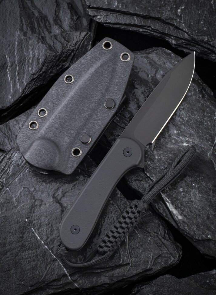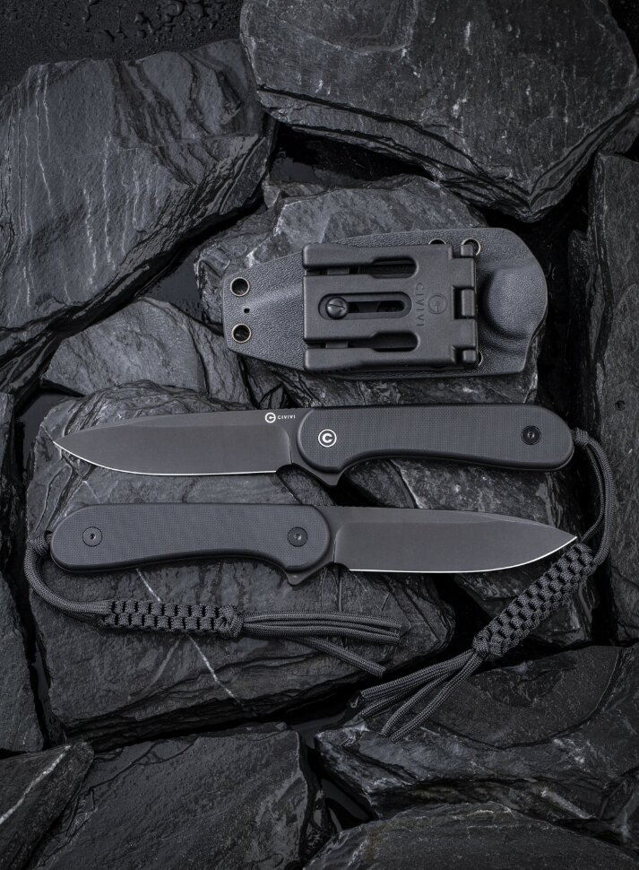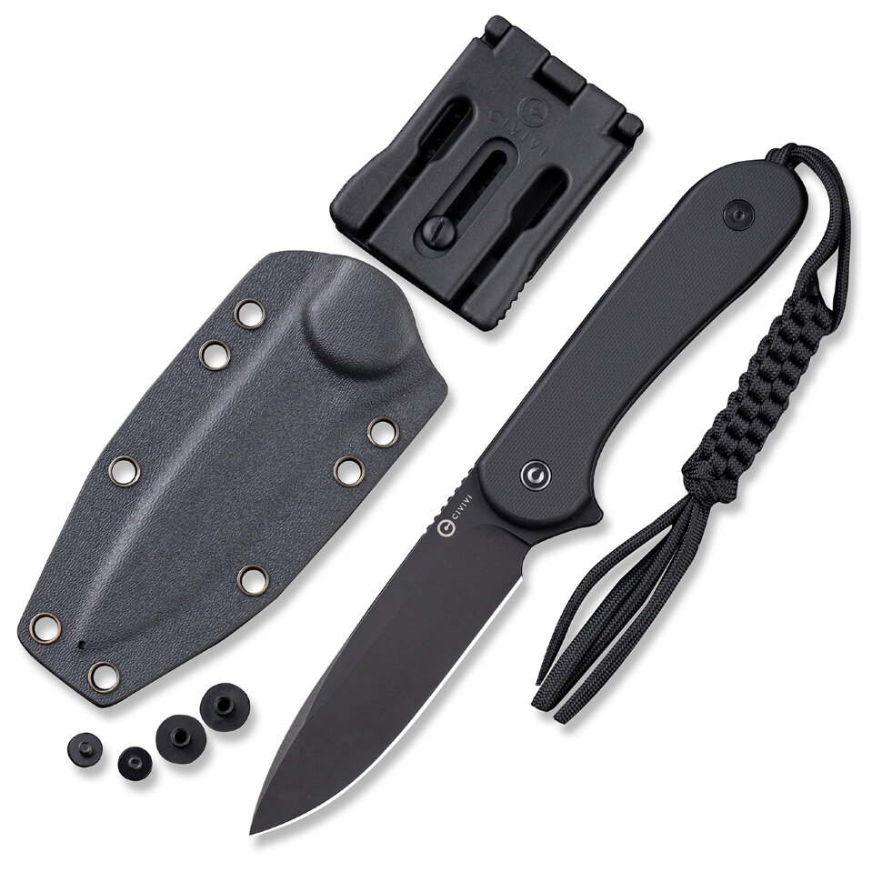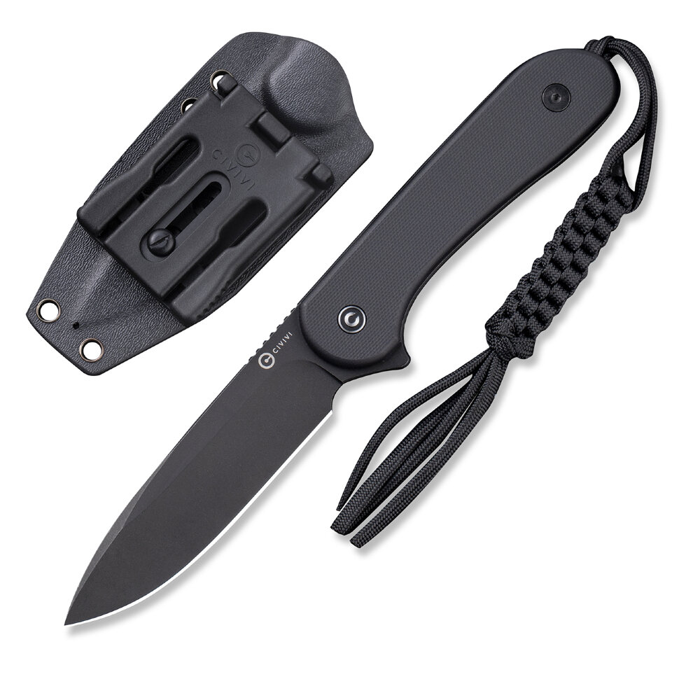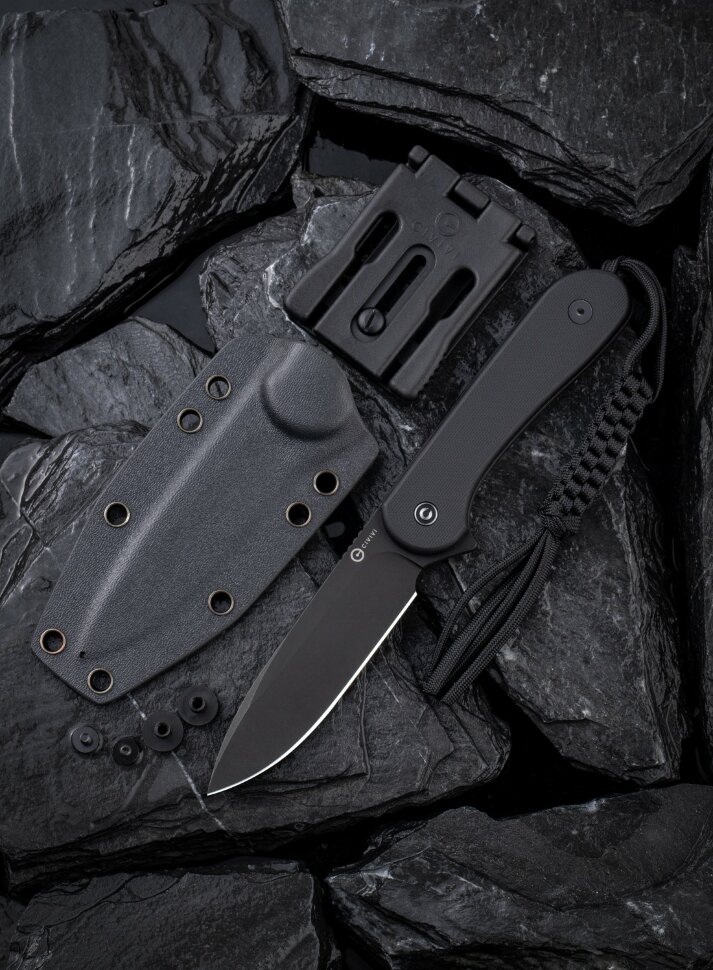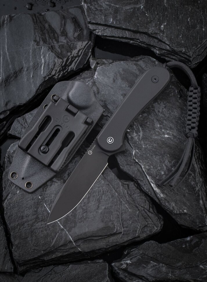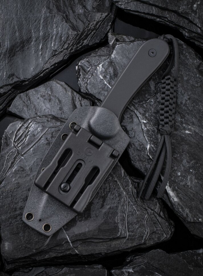Civivi Elementum надежно фиксируется в ножнах из материала Kydex с защелкой и встроенной клипсой для ремня. Чехол защищает клинок от физических повреждений и самого владельца от случайных порезов. К концу рукояти привязан паракорд, чтобы клинок можно было мгновенно вытащить из ножен.