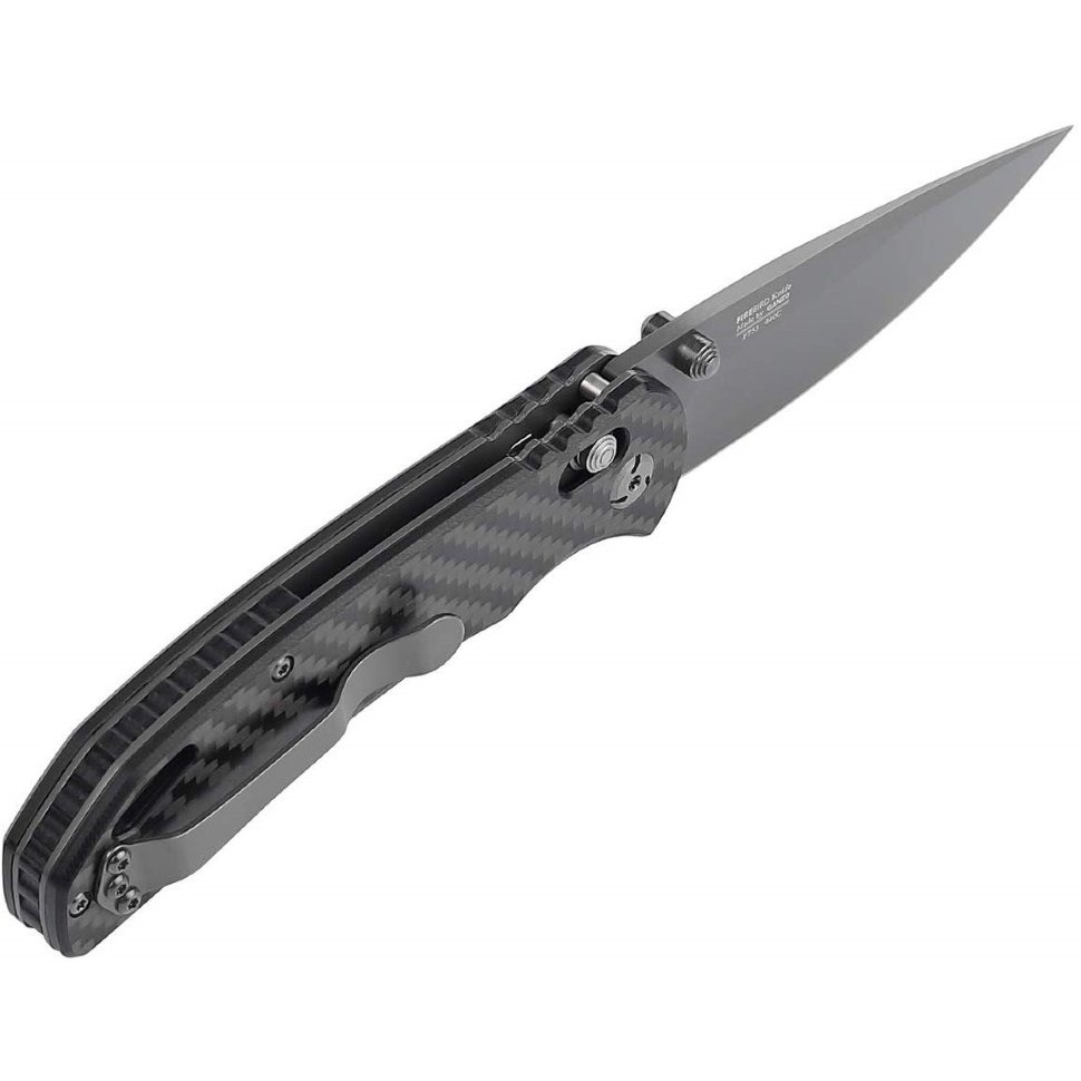 Рукоятка ножа также соответствует требованиям относительно надежности и удобства, которые предъявляются к хорошим тактическим моделям. Она изготавливается из карбона. Материал сделан композитным, что гарантирует высокую прочность при любых работах, выполняемых с помощью данного ножа. Рукоятка сделана черной. На ней имеется клипса, изготовленная из такой же стали, что и лезвие, а также овальное отверстие под темляк.