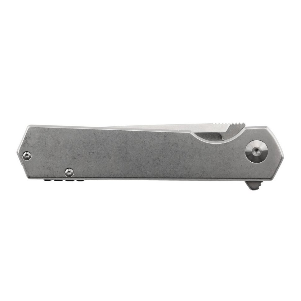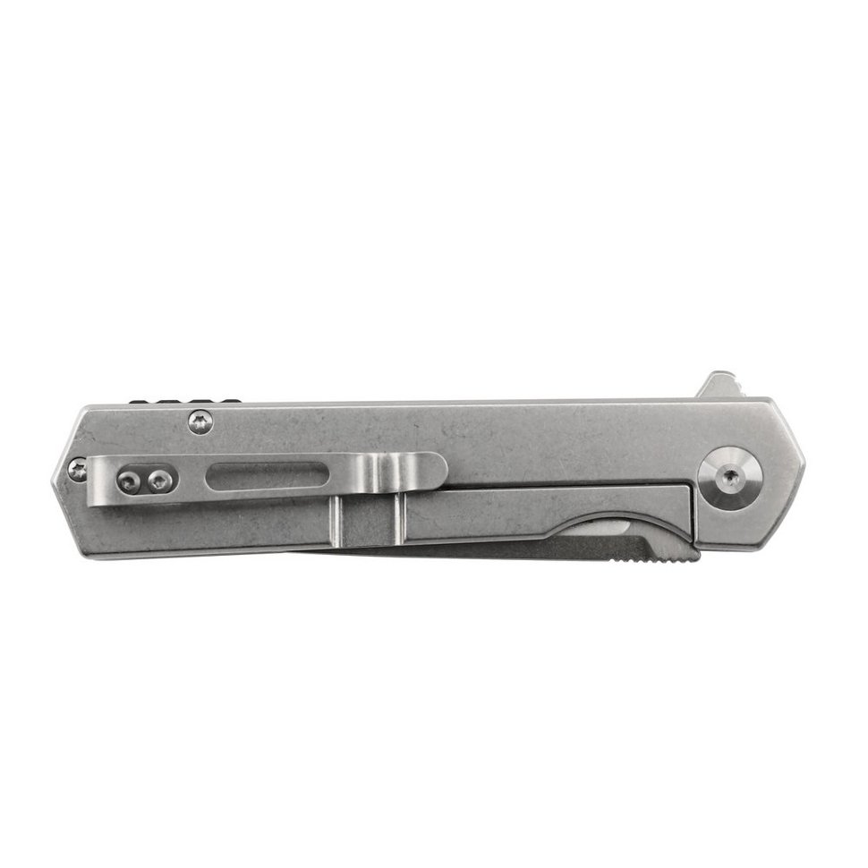 Рукоятка ножа Firebird FH12-SS тоже целиком металлическая, но для этой детали была выбрана другая марка стали – нержавеющая. Форма ручки очень лаконична: она имеет почти одинаковую ширину по всей длине, небольшую выемку под пальцы внизу, прикрученную двумя болтами прижимную клипсу. Кстати говоря, по желанию, клипсу можно переставить на другую сторону рукоятки.