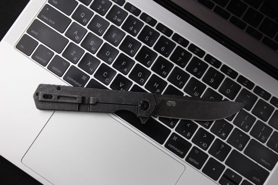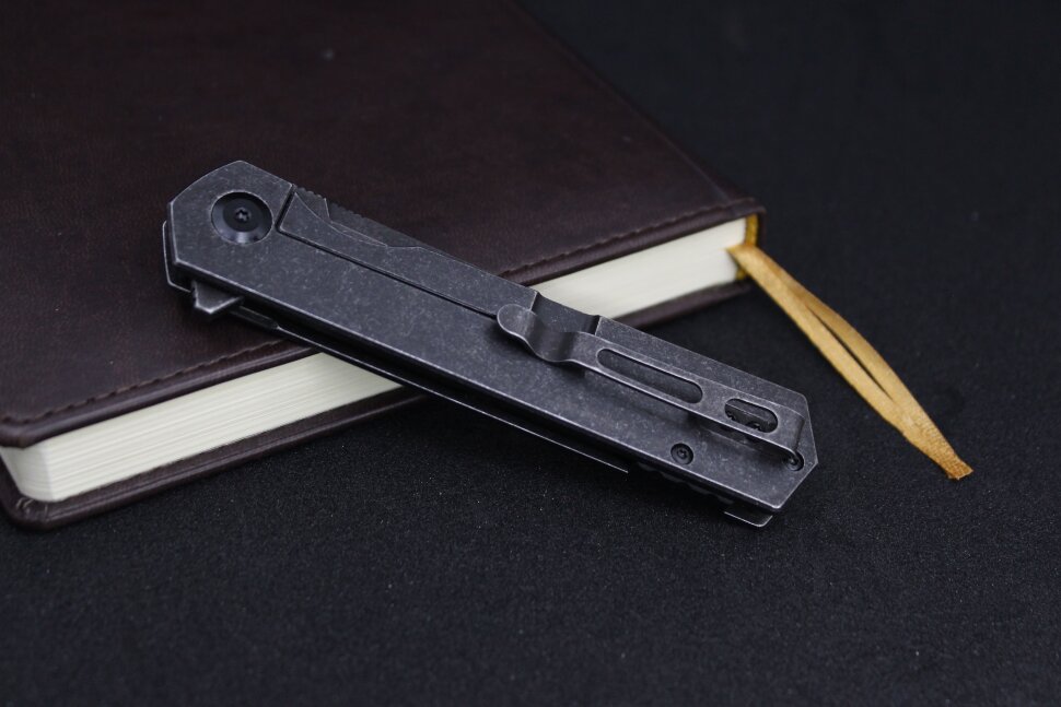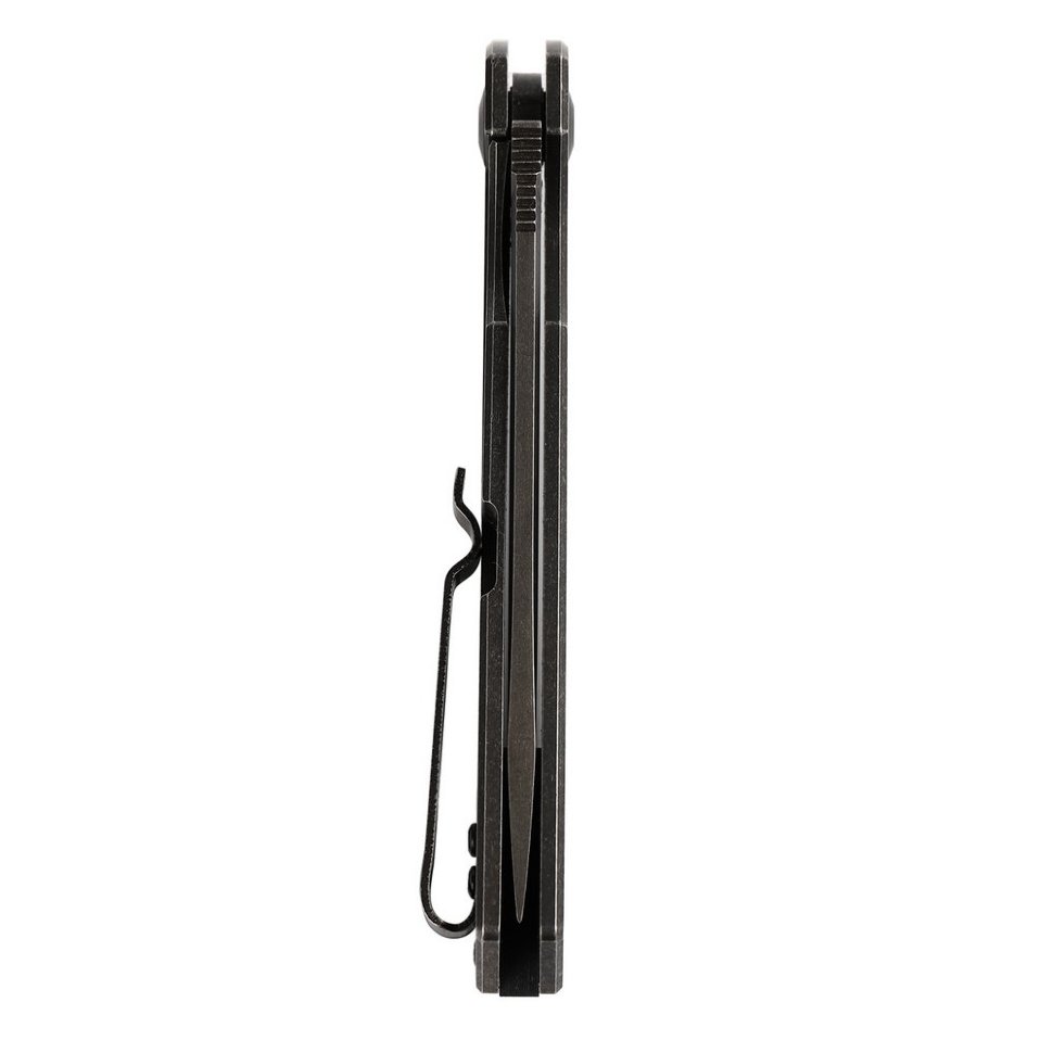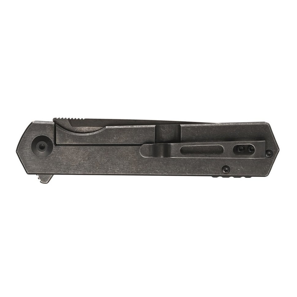 Рукоятка ножа также сделана из стали и прошла финишную обработку тем же методом, что и клинок. Однако для нее используется другой материал - нержавеющая сталь, марку которой производителей не указывают. Этот металл не боится контактов с водой, а потому подходит для изготовления ножей туристического назначения. На одной из сторон рукоятки прикручена прижимная клипса, тоже покрашенная в черный цвет.Этой же стороны хорошо видно, что нож оснащен долговечным замком Frame lock. Частью такого механизма является сама рукоятка ножа. Когда клинок открыт, одна из деталей ручки выполняет роль прижимной пластины, и упирается в его пятку. Чтобы закрыть лезвие, необходимо убрать в сторону эту пластину.