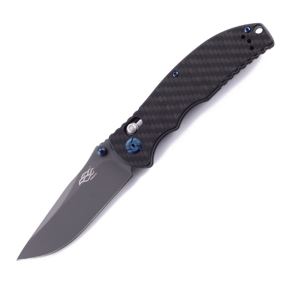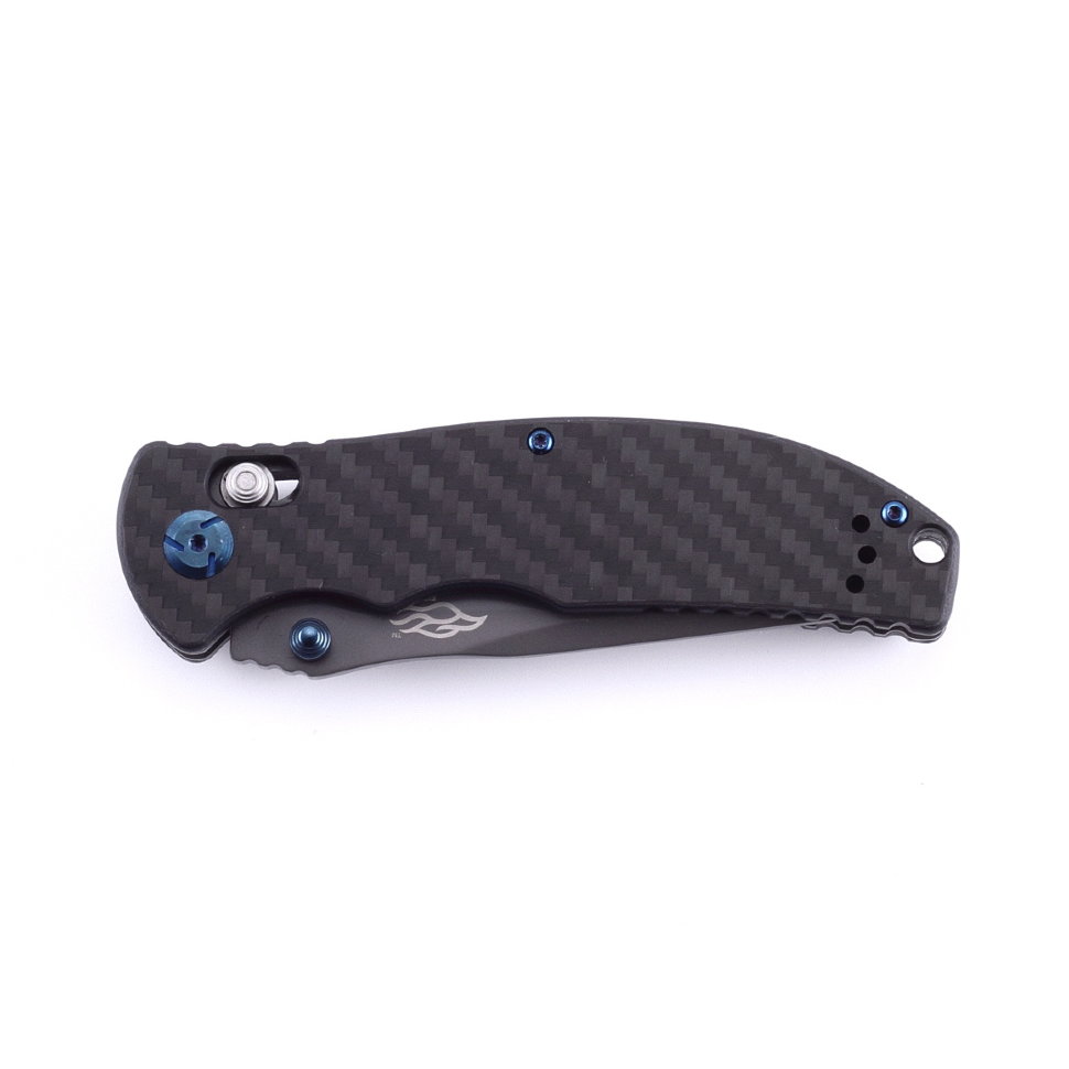 Детали рукоятки изготавливаются из углепластика. Это материал с композитной структурой, который в состоянии конкурировать со сталью по прочности, но при этом, гораздо легче металла. Накладки привинчиваются к базе с обеих сторон. Кроме того, к одной из накладок прикручена металлическая клипса, которая позволяет закрепить нож во время переноски. В модели Firebird F7503-CF ручка сделана черной. Производители предусмотрели и возможность крепления к ножу шнурка для его ношения на запястье. Для этих целей, в рукоятке сделано отверстие.