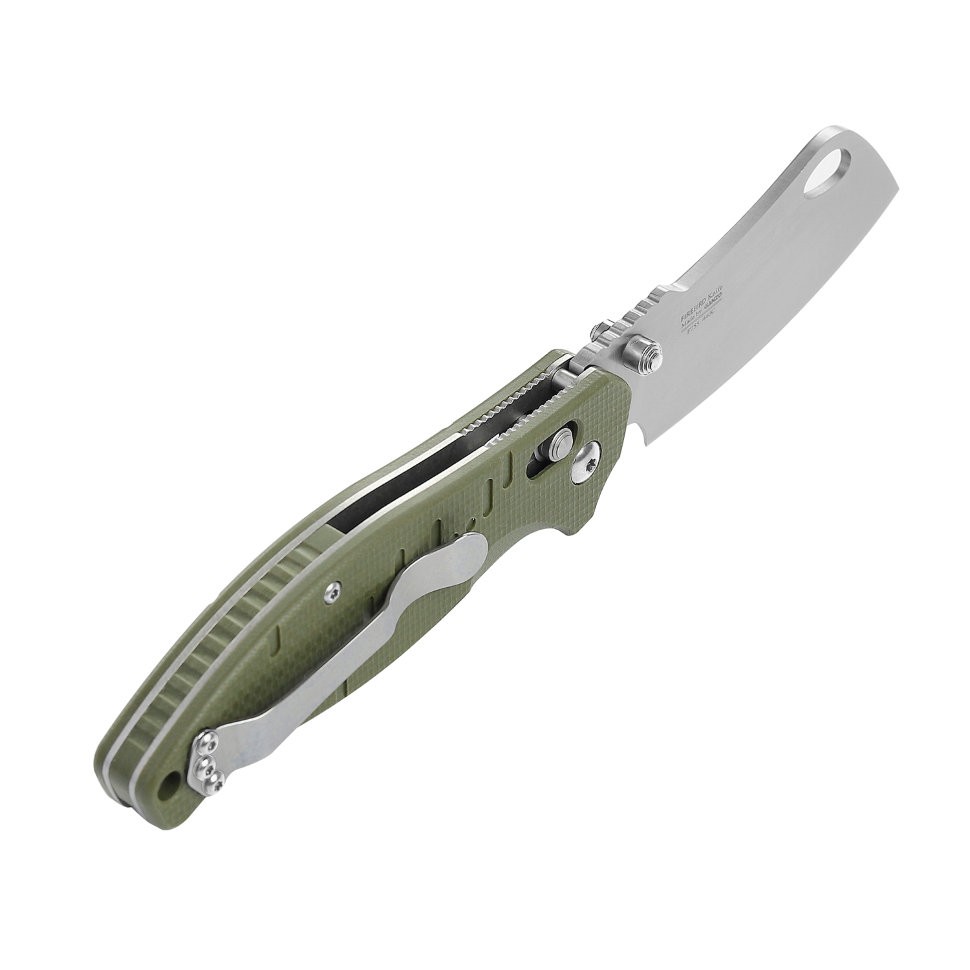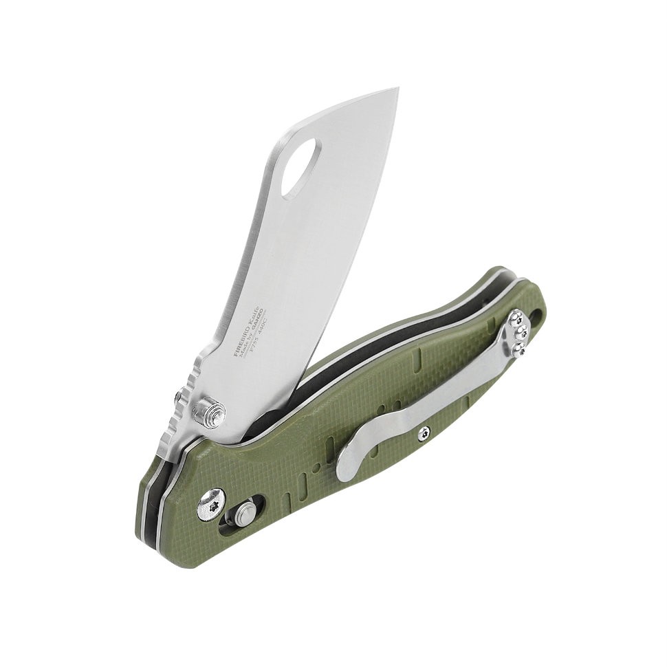 Модель Firebird F7551 сразу же привлекает внимание своим необычным дизайном. Это складной нож с необычно широким клинком. Его форма называется Sheepfoot. Обух ножа от рукоятки идёт практически ровно, однако на последней трети длины сильно изгибается и резко уходит вниз. Режущая кромка тоже почти ровная, гладко заточенная. Колоть таким ножом будет непросто, зато очень удобно резать и шинковать.
