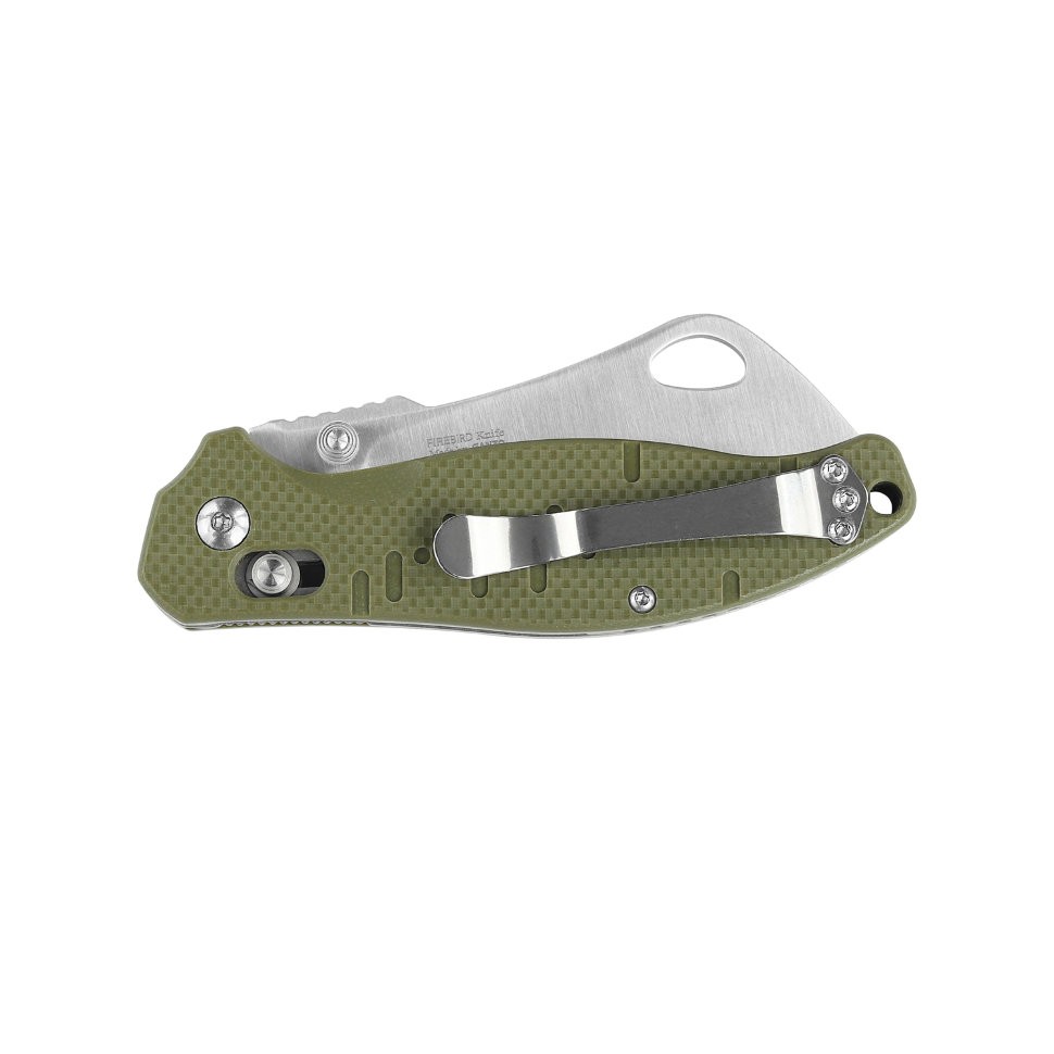 Рукоятка модели Firebird F7551 сделана из стеклопластика G10. Данный материал значительно прочнее обыкновенного пластика, поскольку у него композитная структура. Но он такой же лёгкий, совсем не впитывает воду и отлично сохраняет цвет даже после долгого пребывания на солнце. Firebird F7551 бывает с чёрной, зелёной или оранжевой рукояткой. На ручке закреплена клипса, которая позволяет зафиксировать нож, например, в кармане.