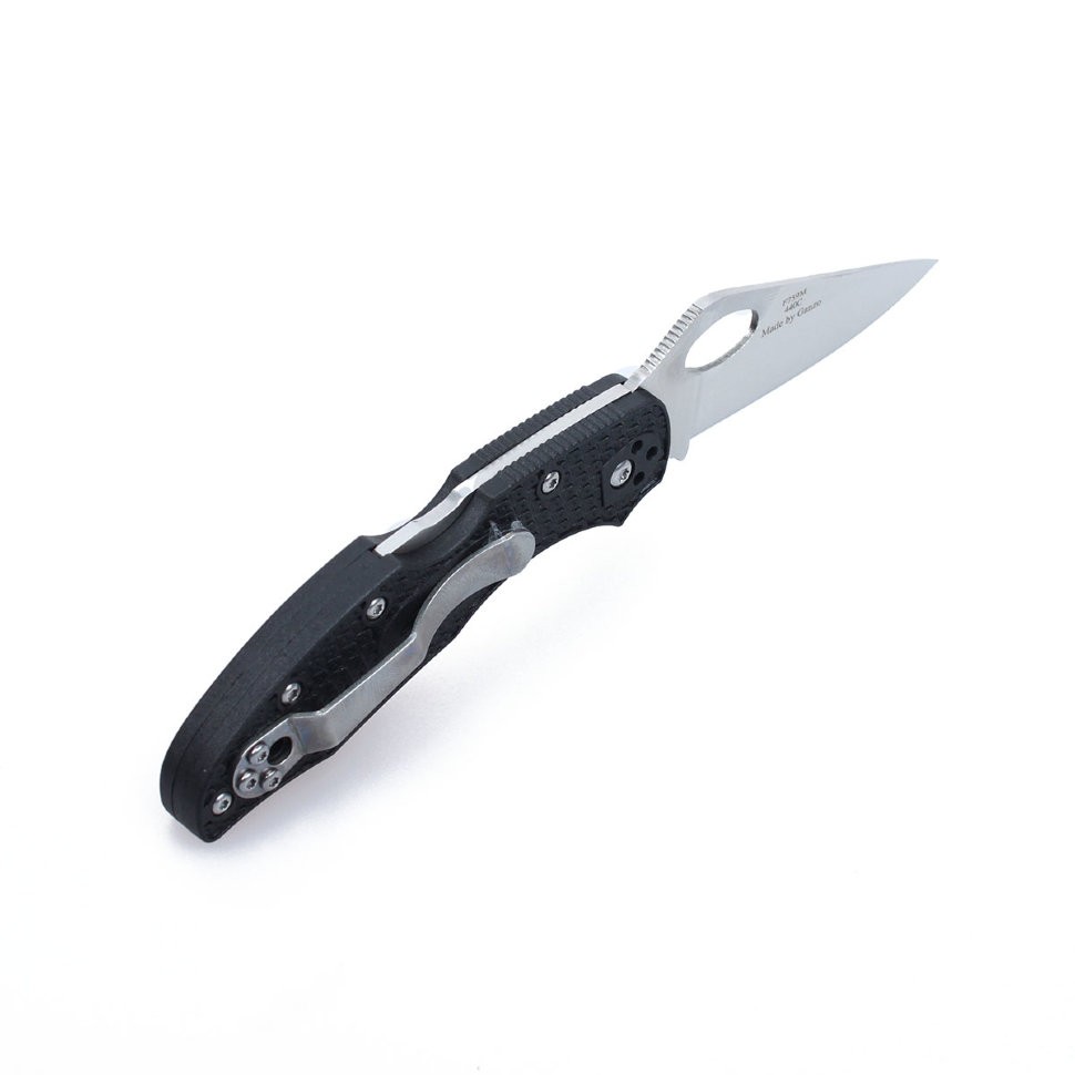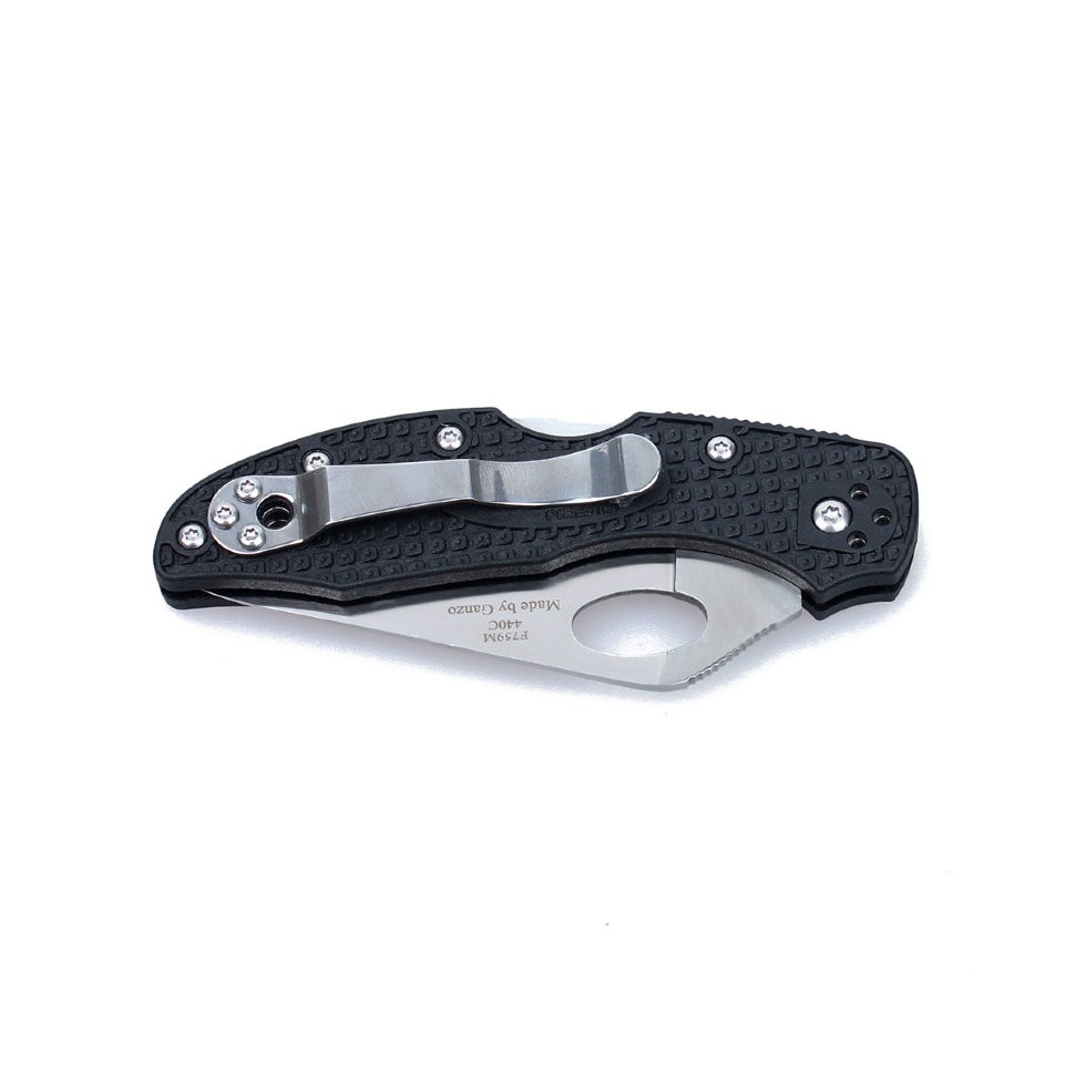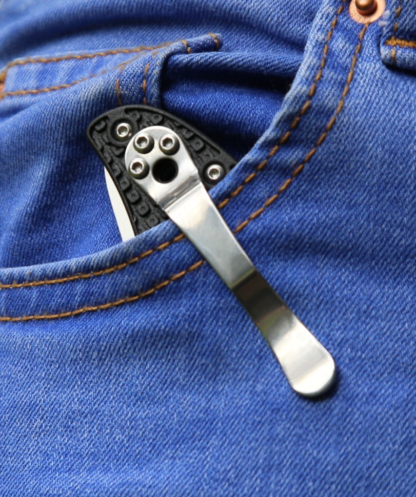 Не менее эффектна и сделанная из наполненного стекловолокном нейлона ручка ножа. Она может быть окрашенной в черный, голубой, оранжевый или розовый цвет (вариант покупатель выбирает сам). Помимо накатки для препятствия скольжению, на ее поверхность нанесен логотип бренда. Кроме того, к ручке ножа прикручена клипса, чтобы пользователь мог носить его на ремне. Положение этой клипсы также можно регулировать на собственное усмотрение.