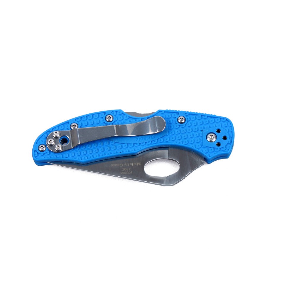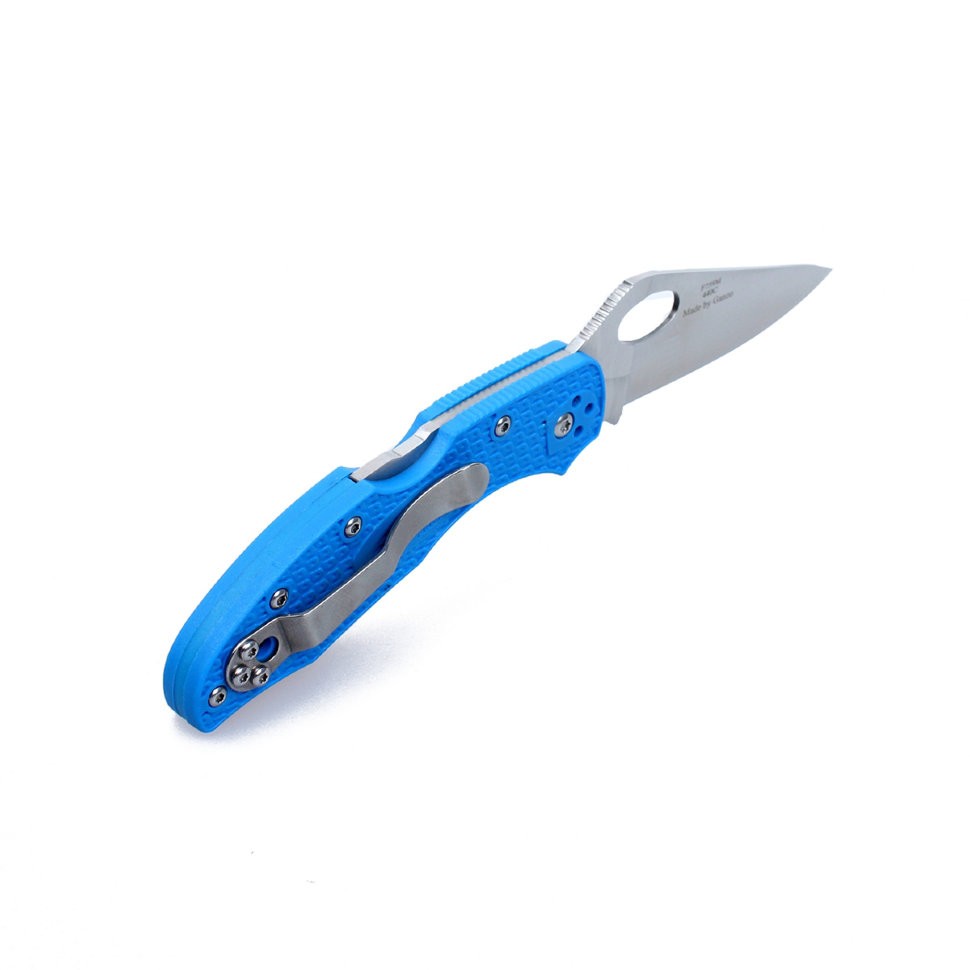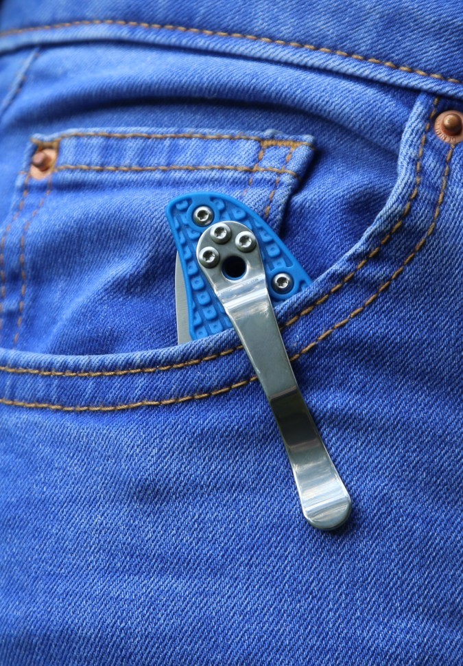 Не менее эффектна и сделанная из наполненного стекловолокном нейлона ручка ножа. Она может быть окрашенной в черный, голубой, оранжевый или розовый цвет (вариант покупатель выбирает сам). Помимо накатки для препятствия скольжению, на ее поверхность нанесен логотип бренда. Кроме того, к ручке ножа прикручена клипса, чтобы пользователь мог носить его на ремне. Положение этой клипсы также можно регулировать на собственное усмотрение.