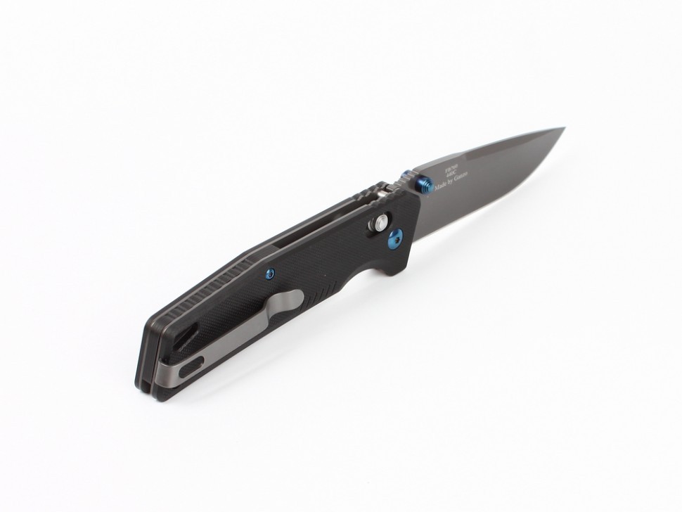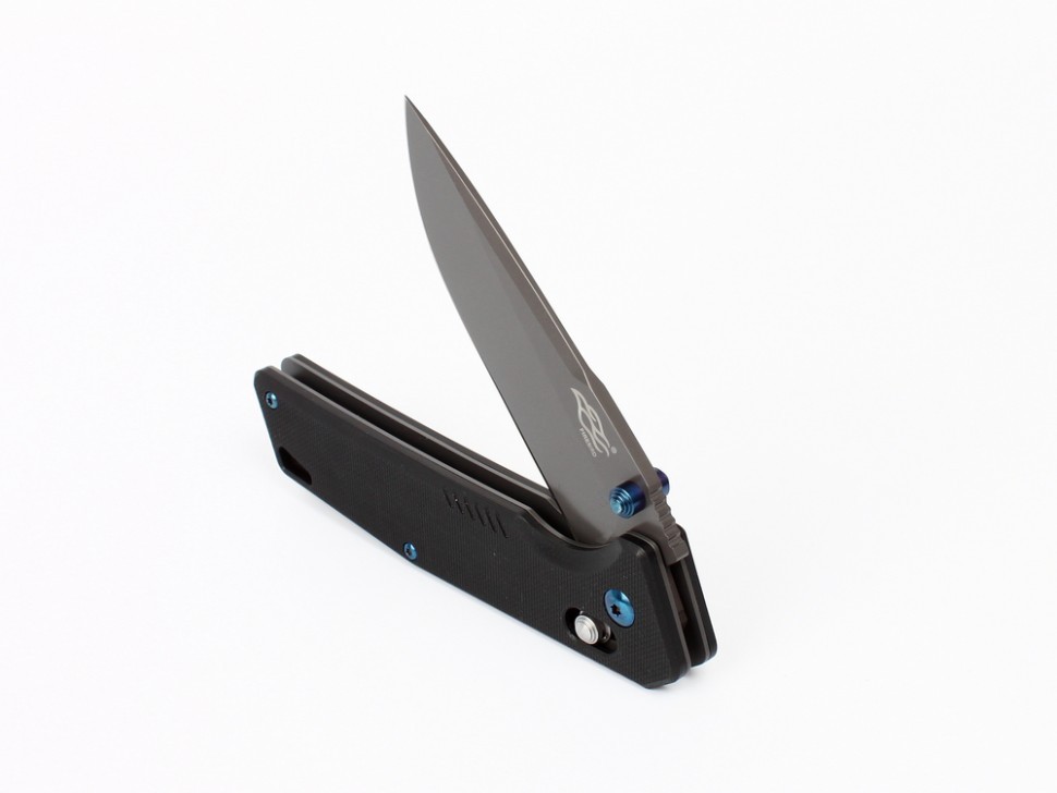 Эта модель ножа получила высокую защиту от коррозии, ведь сделана из не подверженных ржавлению материалов. Для клинка производители взяли сталь 440С. Она без проблем переносит пребывание в сырости, а сделанные из нее ножи нуждаются в самом простом уходе. Длина лезвия составляет 87 мм. Для того, чтобы ножом можно было делать аккуратные разрезы, заточили его гладко, а кроме того, лезвие заканчивается острым кончиком. Его максимальная толщина — 3,3 мм. Необычный внешний вид ножа объясняется тем, что лезвие покрывается специальной порошковой краской, которая не стирается с него при использовании инструмента. В результате этой обработки, оно перестает бликовать на солнце и в целом выглядит очень привлекательно.
