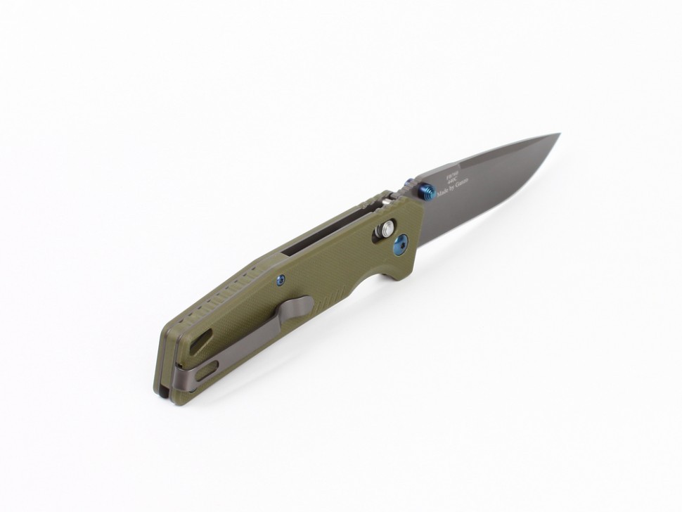 Вариантов рукоятки для данной модели производители предусмотрели сразу несколько, чтобы обеспечить покупателям как можно более широкий выбор. Так, для ее изготовления может быть использован стеклопластик G10 или же карбоновое волокно. Оба материала являются композитными по структуре, так что обладают высокой прочностью, не смотря на то, что они очень легкие. Кроме того, они легко поддаются изначальной обработке и формовке, так что ручка ножа делается очень удобной для хвата. В случае выбора варианта с карбоновой рукояткой, она будет окрашена в черный цвет. Для стеклопластика же предусмотрено сразу несколько вариантов расцветок: черная, зеленая, камуфляжная и оранжевая. Ручка каждого типа сделана не скользкой за счет особой текстуры поверхности. На ней закреплена стальная клипса и сделано небольшое треугольное по форме отверстие для крепления темляка.