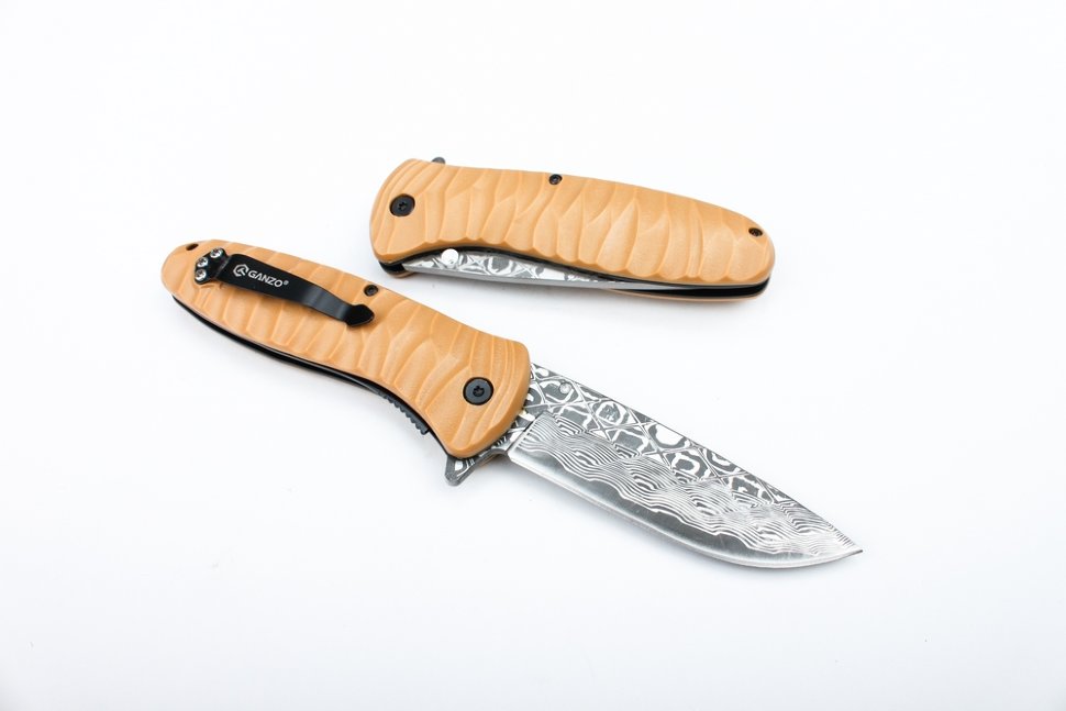 Нож Ganzo G622-DY-2 с первого взгляда выделяется среди других моделей. Во многом — благодаря своему яркому дизайну. Рукоятка этой модели сделана из коричневого рифленого пластика ABS.