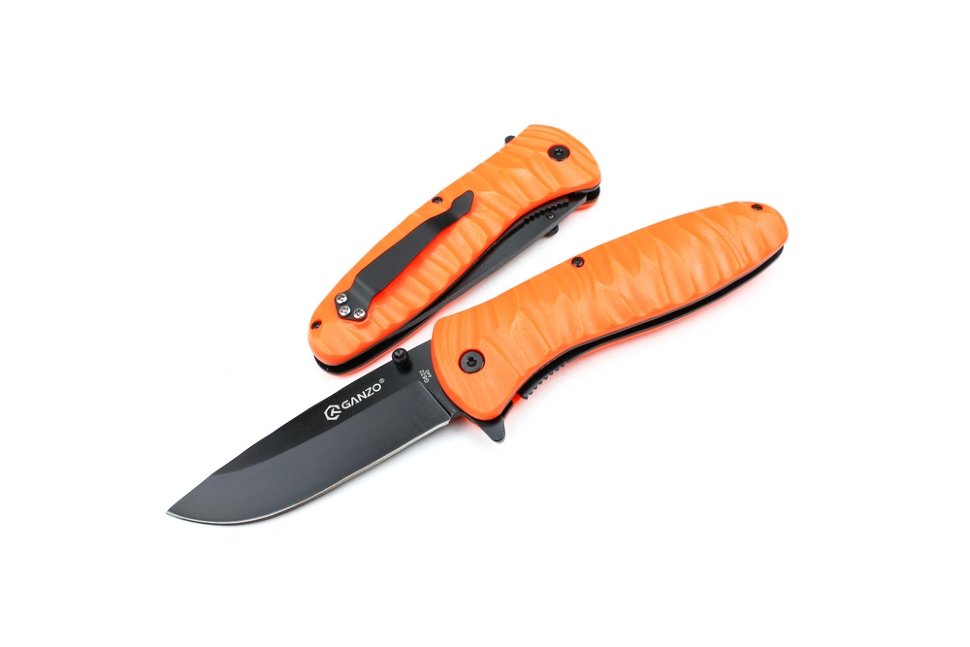 Нож Ganzo G622-O-1 с первого взгляда выделяется среди других моделей. Во многом — благодаря своему яркому дизайну. Рукоятка этой модели сделана из яркого оранжевого рифленого пластика ABS, а клинок — вороненый.