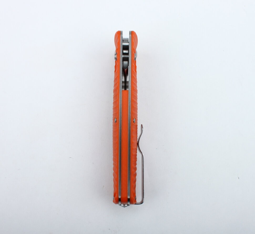 Для накладок на рукоятку ножа производители использовали современный вид пластика высокой прочности под названием G10. По сути, он представляет собою композитный материал из эпоксидных смол и стеклоткани. Этот материал обладает высокой прочностью, хорошо выдерживает удары, противостоит влаге и долгое время сохраняет яркий цвет. Рукоятка ножа Ganzo G720 неровная. Такая форма одновременно играет роль элемента дизайна и способствует надежному хвату.