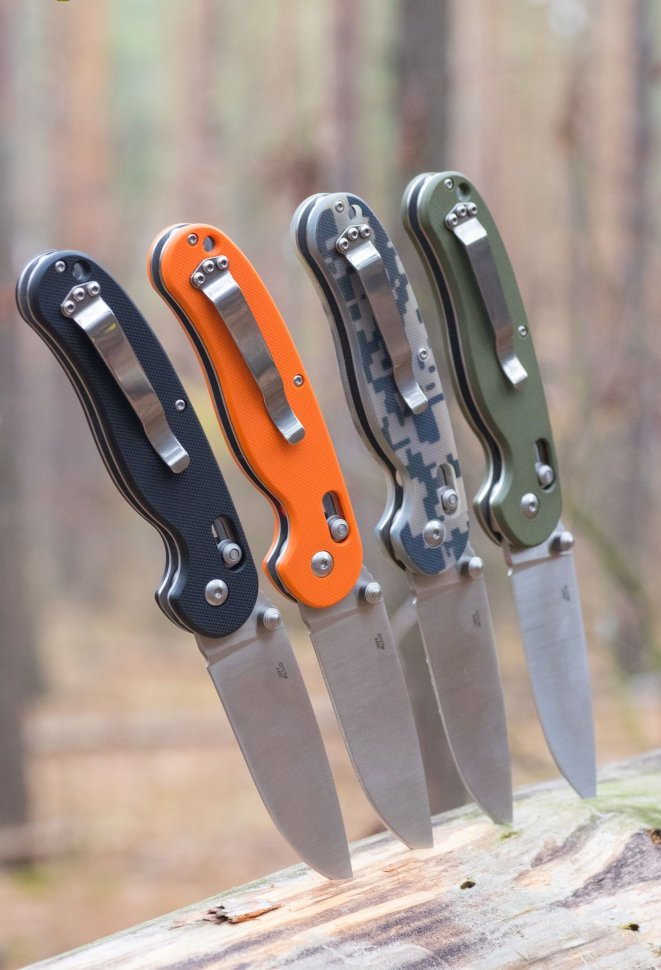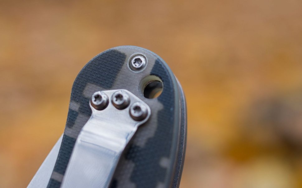 Рукоятка ножа получила накладки из композитного стеклопластика G10. Это прочный и износостойкий материал, который позволяет легко изготовить ручку эргономичной формы. Что касается выбора цвета, то покупателям доступны несколько вариантов: камуфляжный, черный, оранжевый и зеленый. На рукоятке каждого ножа имеется стальная клипса, для пристегивания к карману или ремню, а также отверстие, в которое можно продеть ремешок на руку.