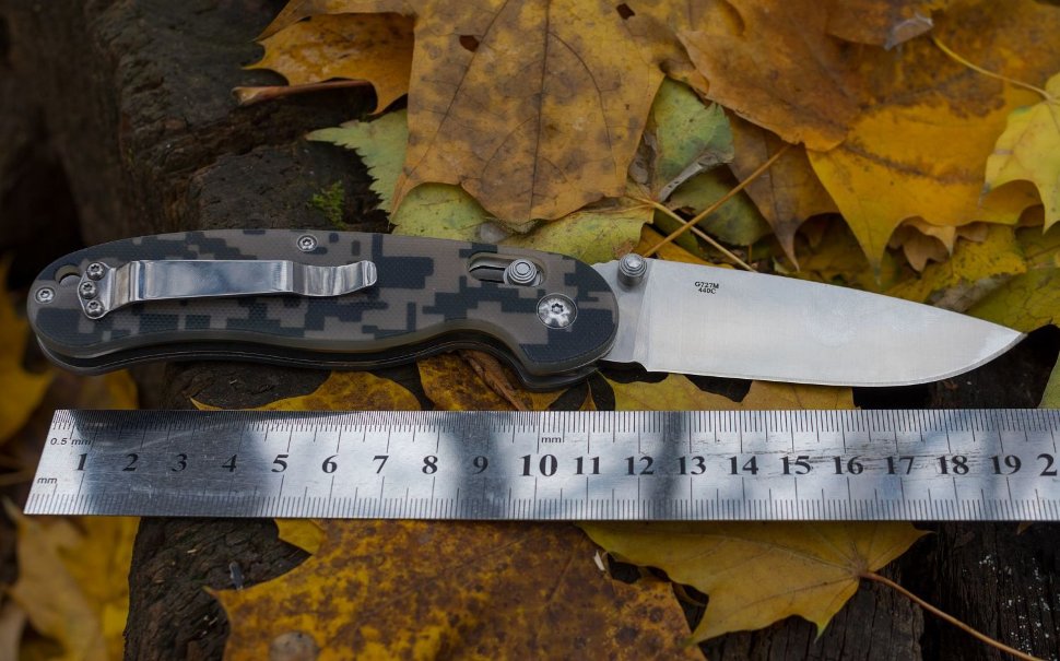 Удобство ножа Ganzo 727M заключается в том, что это складная модель. Он без труда поместится в любом рюкзаке или даже в кармане одежды. Длина ножа в этом состоянии составляет всего 12 см. Зато при открывании его размеры увеличиваются до 21 см, из которых 8,9 см приходится на лезвие. Клинок заточен заточкой гладкого типа, что также влияет на его универсальность. Толщина клинка в самом широком месте составляет 0,35 см. Для его изготовления производители использовали одну из наиболее сбалансированных марок нержавеющей стали — 440С. Такой сплав хорошо противостоит образованию ржавчины и появлению других признаков коррозии. При этом, он достаточно прочный — 58 HRC, а также недорогой.