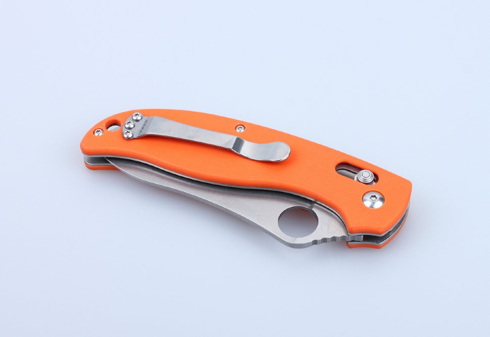 Для рукоятки из стеклопластика изготовлены две накладки. Они прикреплены болтами по обе стороны металлической основы. В данном случае, используется пластик G10,являющийся одним из наиболее современных и прочных. Его внешняя сторона текстурирована, чтобы рукоятка не скользила в ладонях. Ручка Ganzo G733 может быть окрашена в оранжевый, черный, темный зеленый или же камуфляжный цвет. Любой из вариантов одинаково надежен и долговечен.