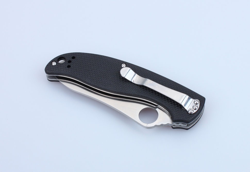 На полотне клинка есть сквозное круглое отверстие. Оно делает дизайн ножа узнаваемым и запоминающимся. Но основное назначение этого отверстие — заменить собою шпенек для открытия сложенного клинка. Кстати, в данной модели используется долговечный и надежный замок конструкции Liner-Lock. Несмотря на свою простую конструкцию, этот замок продолжает лидировать по популярности. Случайное открытие ножа с таким замком попросту исключено.