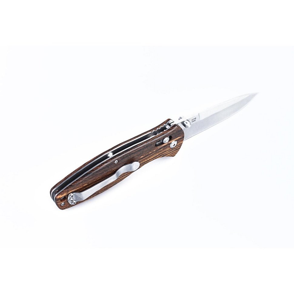 Модель G738-W1 ориентирована на полевое использование. Это складной нож,который можно носить просто в кармане одежды или же прикрепить к ремню на поясе. Он не нуждается в чехле, хотя этот аксессуар и поможет дополнительно защитить нож от грязи. Клинок ножа не ржавеет, поскольку изготовлен из стойкого к коррозии сплава 440С. Поэтому G738-W1 подходит рыбакам, для которых практически невозможно избежать контакта ножа и воды. Он хорошо себя зарекомендовал и в туристических походах, когда погода может внезапно поменяться с ясной на дождливую. Но чтобы нож на 100% сохранял свои рабочие качества, его лучше насухо протирать после каждого использования. Лезвие формы drop point очень удобно использовать как для подсобных работ, так на полевой кухне. Оно гладко заточено. Длина лезвия равна 89 мм, а с учетом рукоятки габариты ножа достигают 210 мм. Толщина клинка этого ножика — 3,3 мм.