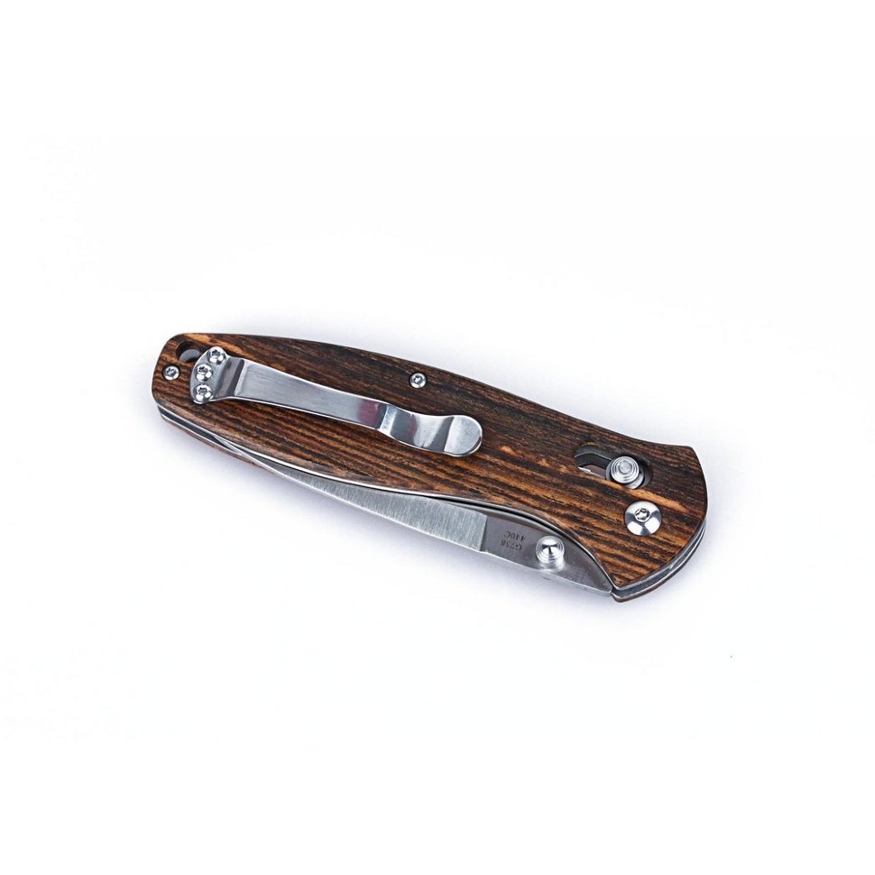 Ручка ножа G738-W1 получила плавные формы, благодаря чему его удобно держать и с ним легко работать. Материал — дерево. На рукоятке есть клипса, для фиксации на ремень, закрепленная тремя болтами, а также отверстие для присоединения темляка.