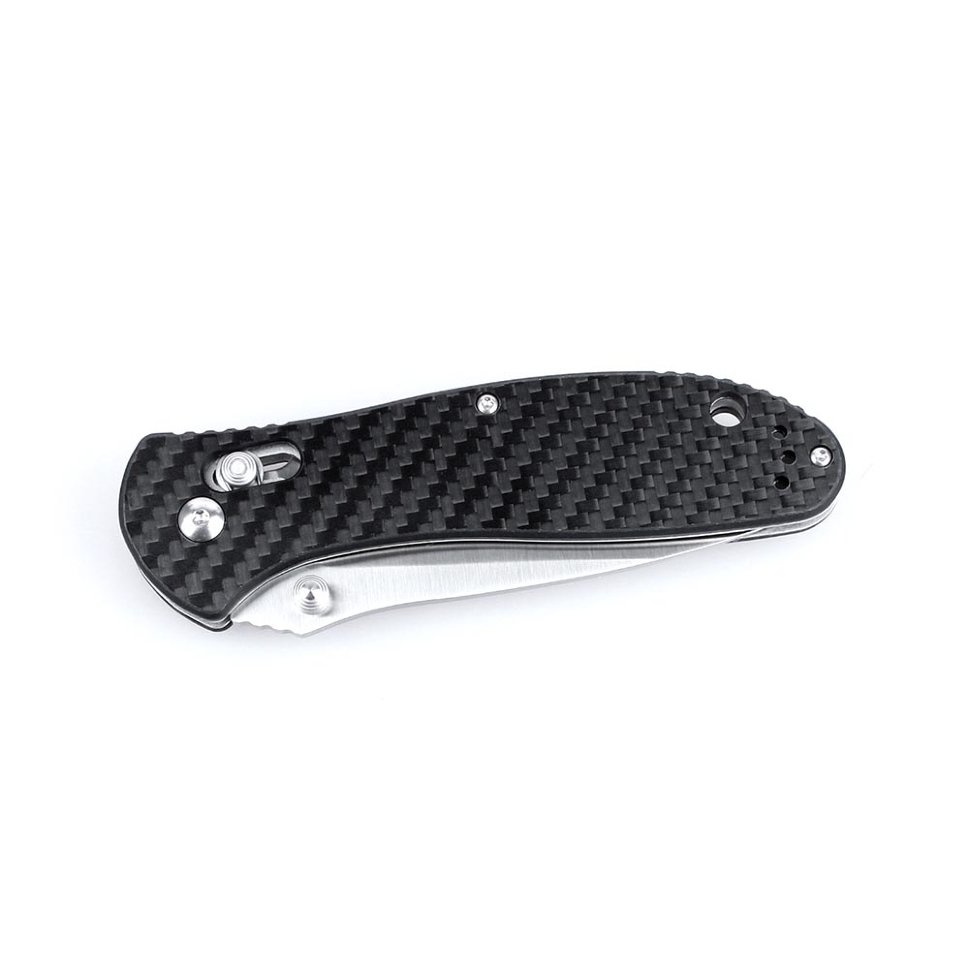 Рукоятка ножа оснащена двумя карбоновыми накладками. Этот материал может быть даже прочнее стали. В то же время, он легкий, не переохлаждается на морозе и комфортный для рук во время летней жары. Рукоятка окрашена в классический черный цвет. К ней также прикреплена клипса из той же стали, что и лезвие ножа.