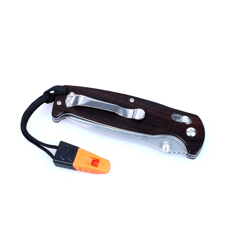 Деревянная рукоятка ножа гармонирует с дизайном его клинка. Она окрашена в темный цвет и обработана так, чтобы не впитывать воду. Дерево остается одинаково приятным на ощупь в морозы или после пребывания ножа на солнце летом. В рукоятке сделано отверстие, в которое продет темляк, а к концу этого страховочного шнура присоединен свисток. Также на рукоятке располагается и клипса для пристегивания ножа к ремню.