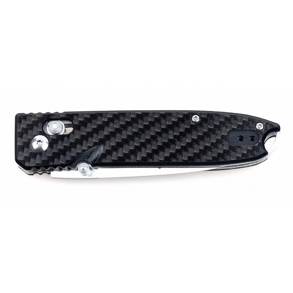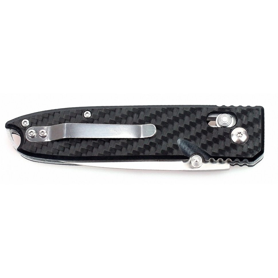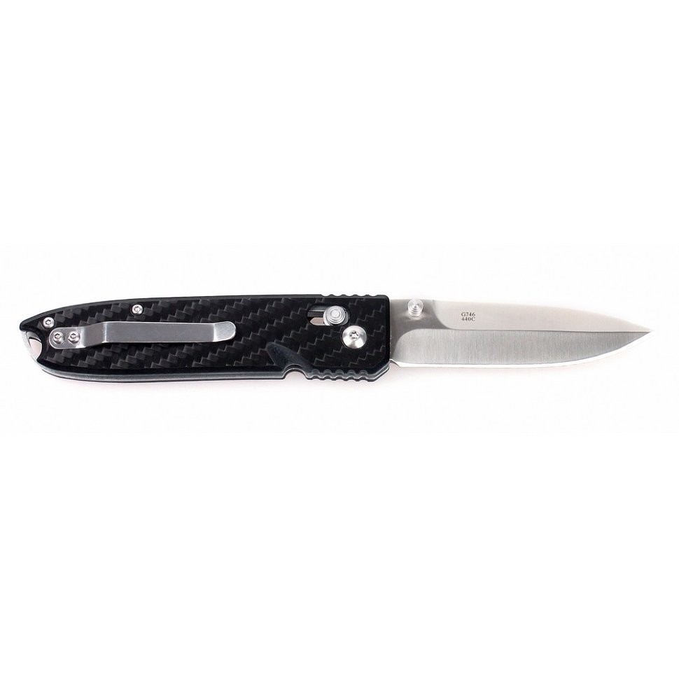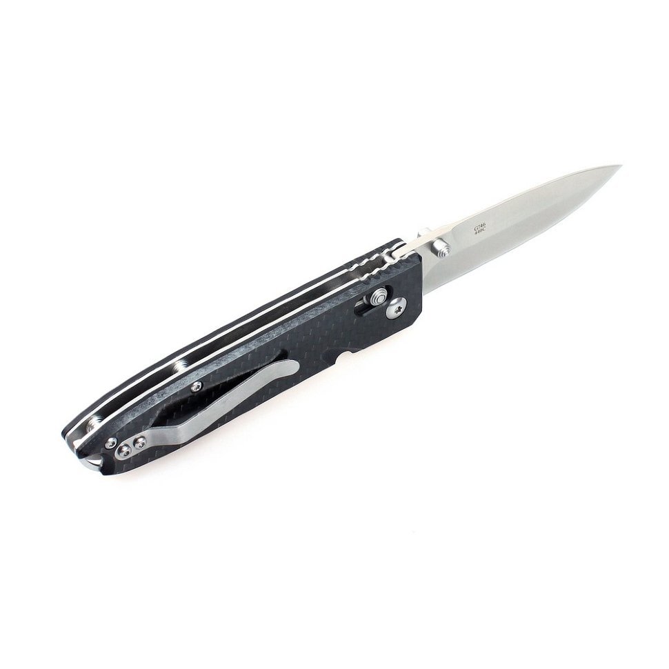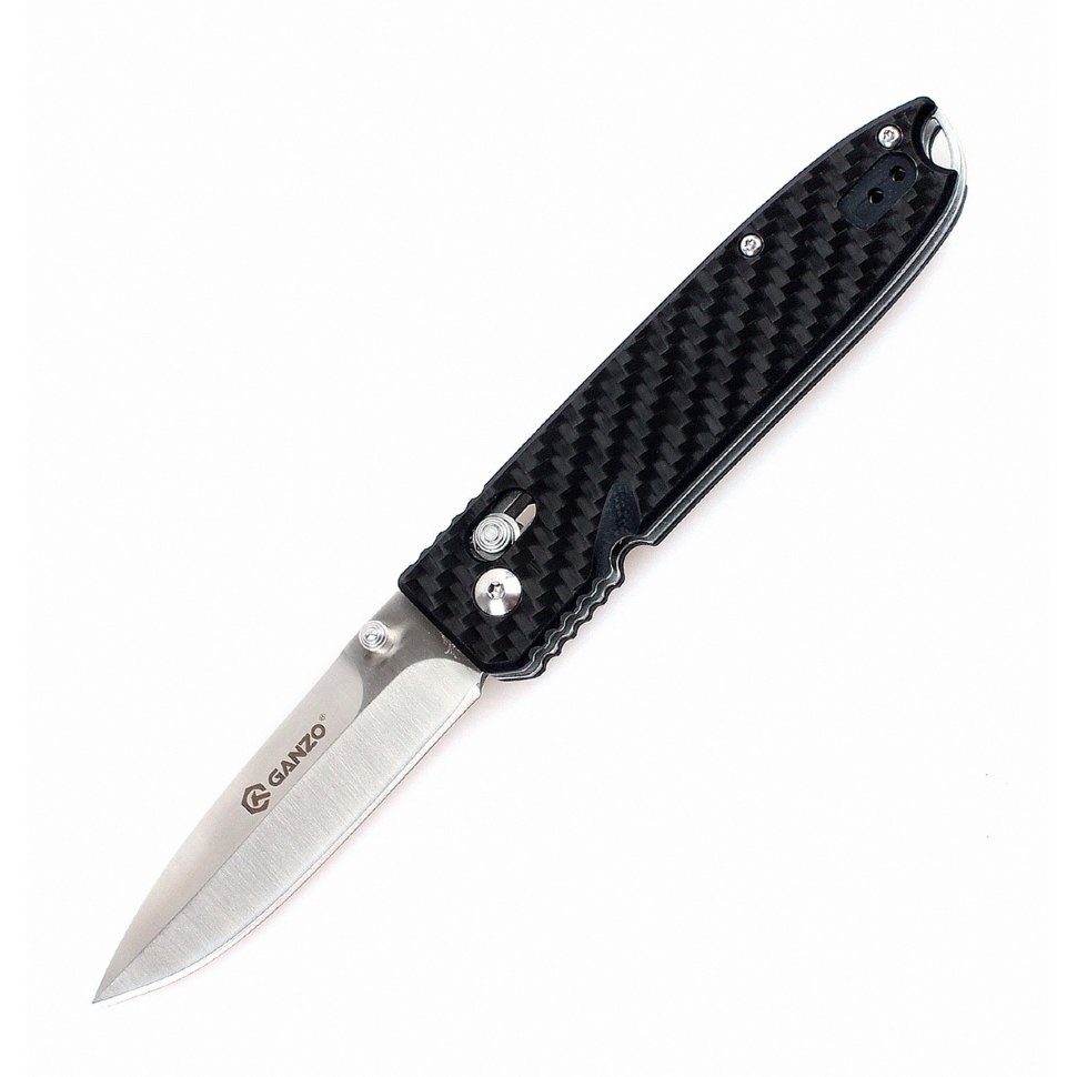Рукоятка Ganzo G746-1-CF — карбоновая. Такой выбор материала имеет массу преимуществ: ручка ножа максимально облегчена, но очень удобна, нож приятно ложится в ладонь даже зимой. Для удобства пользователей, на рукоятке размещается клипса, которая дает возможность носить нож на ремне и может быть прикручена с любой стороны ручки.