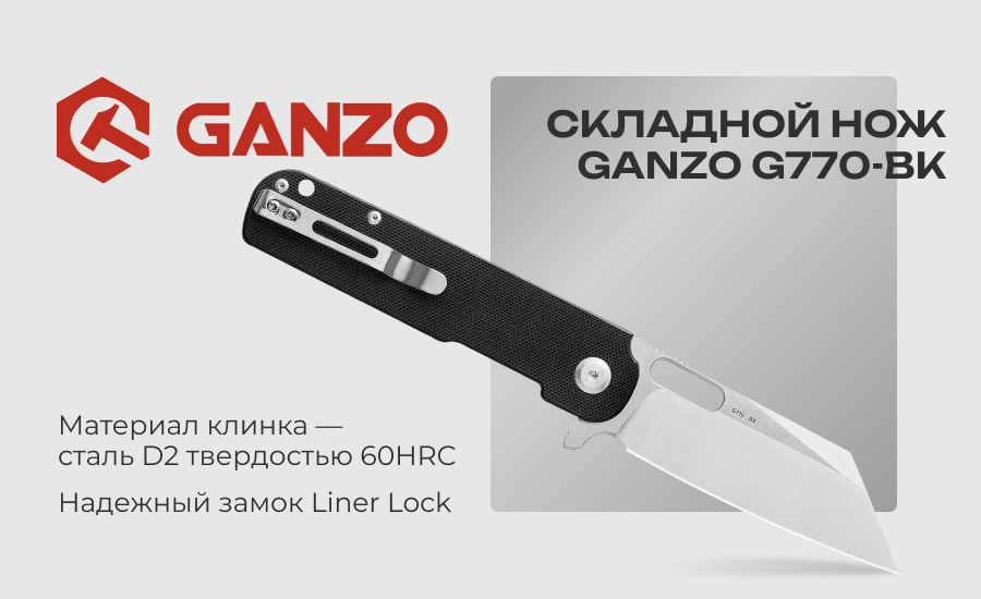 Ganzo G770-BK — это складной EDC-нож, который отлично подходит для туризма, охоты и повседневного ношения. Он обладает широким прочным лезвием reverse tanto из стали D2, которое сочетает длинную режущую кромку и острый кончик. Такая форма ножа Ganzo делает его универсальным как для режущих, так и для колющих работ. Нож Ganzo G770-BK — универсальный и практичный инструмент для различных ситуаций.