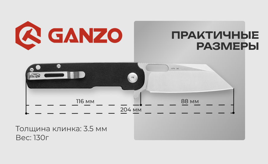Общая длина ножа Ganzo G770-BK составляет 204 мм, длина клинка — 88 мм. Вес ножа — 130 г, что делает его легким и удобным для ношения. Клинок формы reverse tanto обеспечивает точный и эффективный рез.