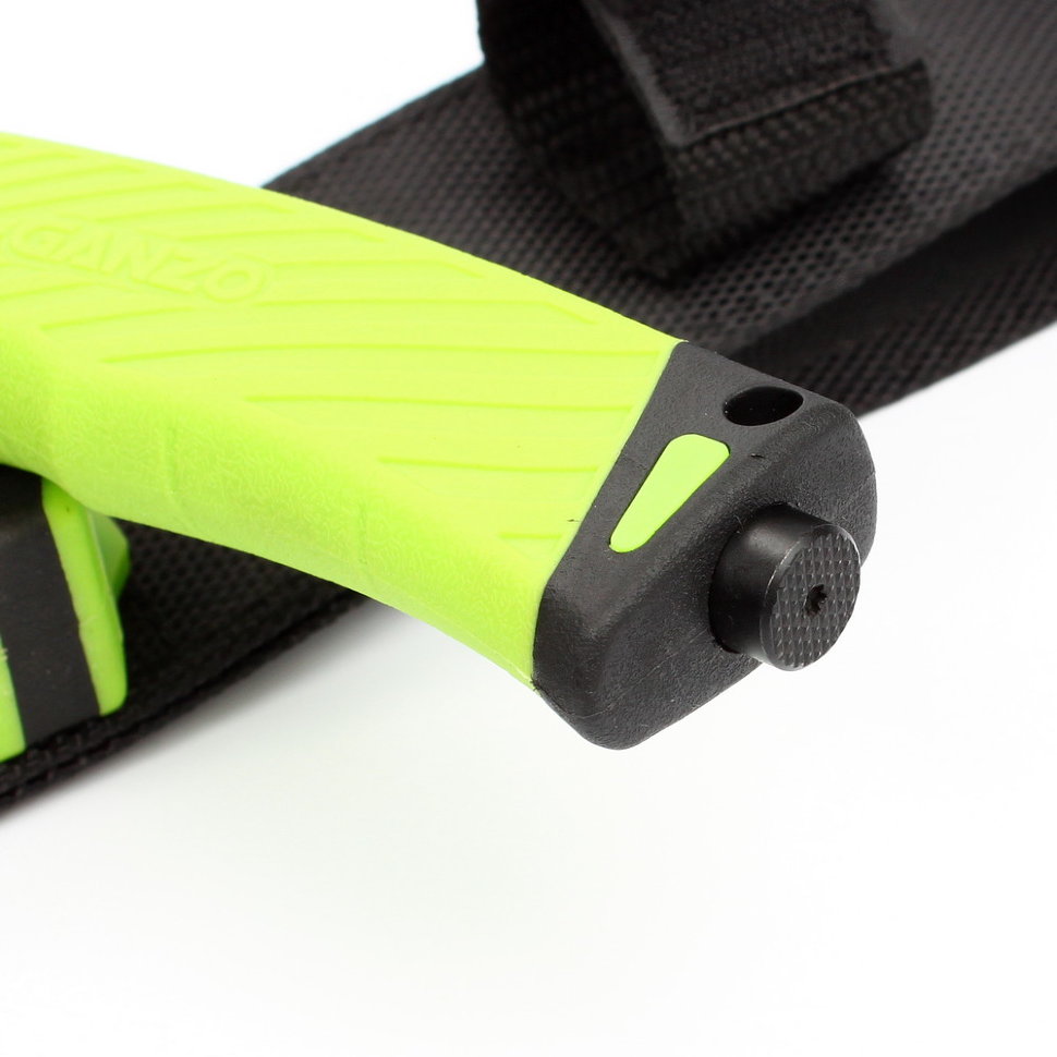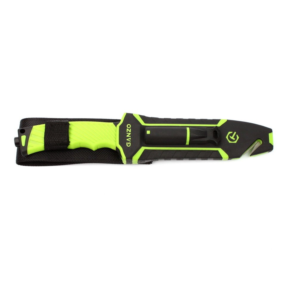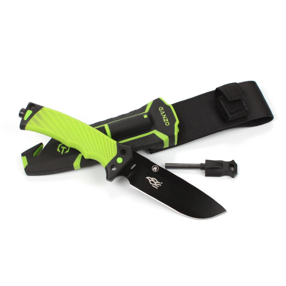 В комплекте с ножом Ganzo G803 пользователю также предоставляются многофункциональные пластиковые ножны, обладающие интегрированным стропорезом и небольшой точилкой, а также имеющие съёмное огниво.