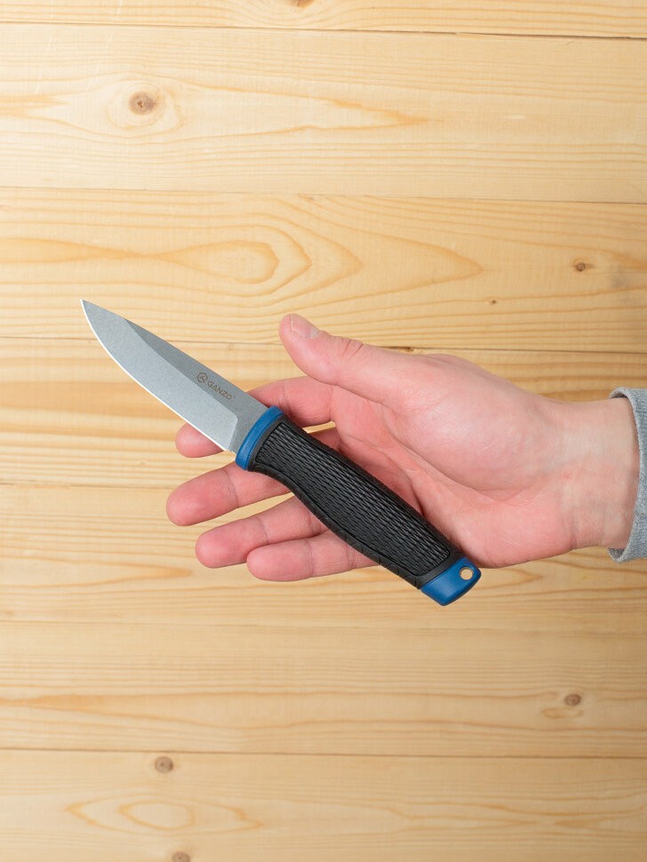 Эргономичная рукоять сделана из материала ПП+ТПР. ТПР или термопластичная резина – это синтетический полимер, обладающий свойствами резины и пластика. В перчатках он используется как слой, защищающий руку от ударных воздействий – способен поглощать и рассеивать энергию удара. Работать таким ножом безопасно и удобно. Ножны полипропиленовые. В конструкции ножен возможны незначительные изменения.
