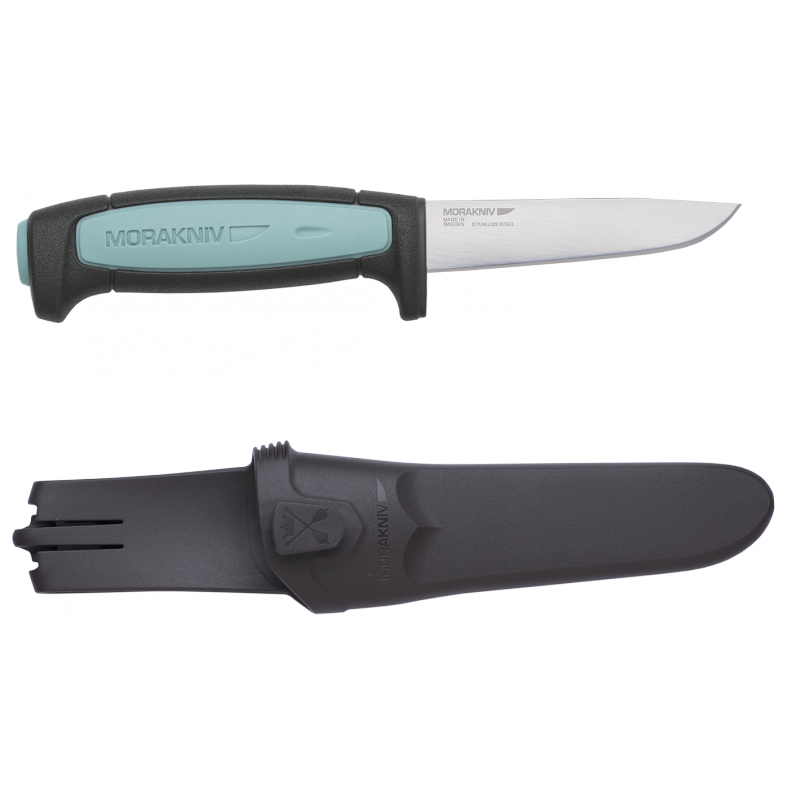Рукоять эргономичной формы, как в модели серии Basic, не доставляет неудобств при использовании инструмента. Для ее изготовления был использован прорезиненный пластик черного цвета со вставками светло-синего цвета. По традиции, нож комплектуется пластиковыми ножнами черного цвета с надежной фиксацией клинка и удобным зажимом для крепления на поясе.