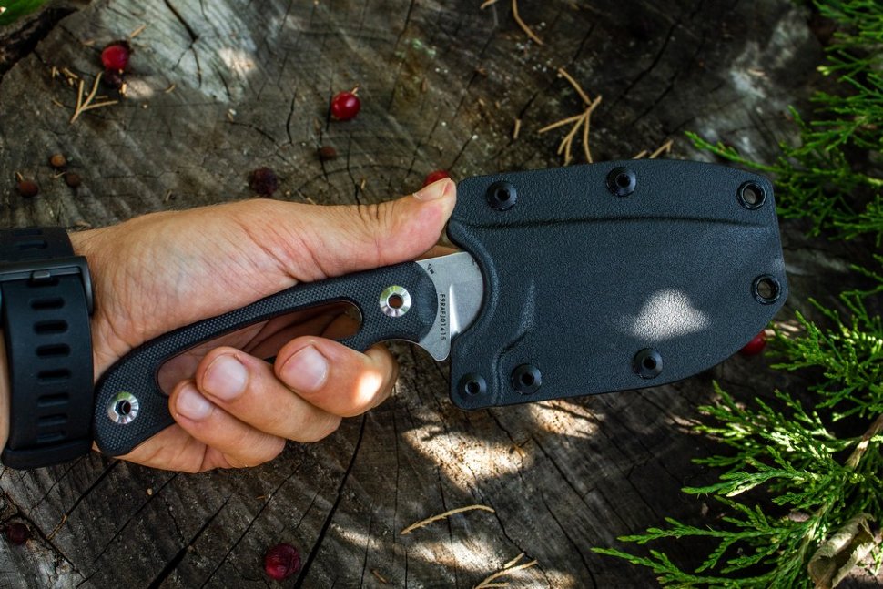 Рукоятка изготавливается из стеклоткани G10. Этот слоистый материал обладает высокой прочностью, не впитывает влагу, выдерживает самые разные нагрузки. Ручка ещё и эргономичной формы, а потому совершенно не выскальзывает из руки в любых условиях. В центре рукояти выполнено овальное отверстие, которое значительно облегчает конструкцию ножа, но не ухудшает его характеристики.