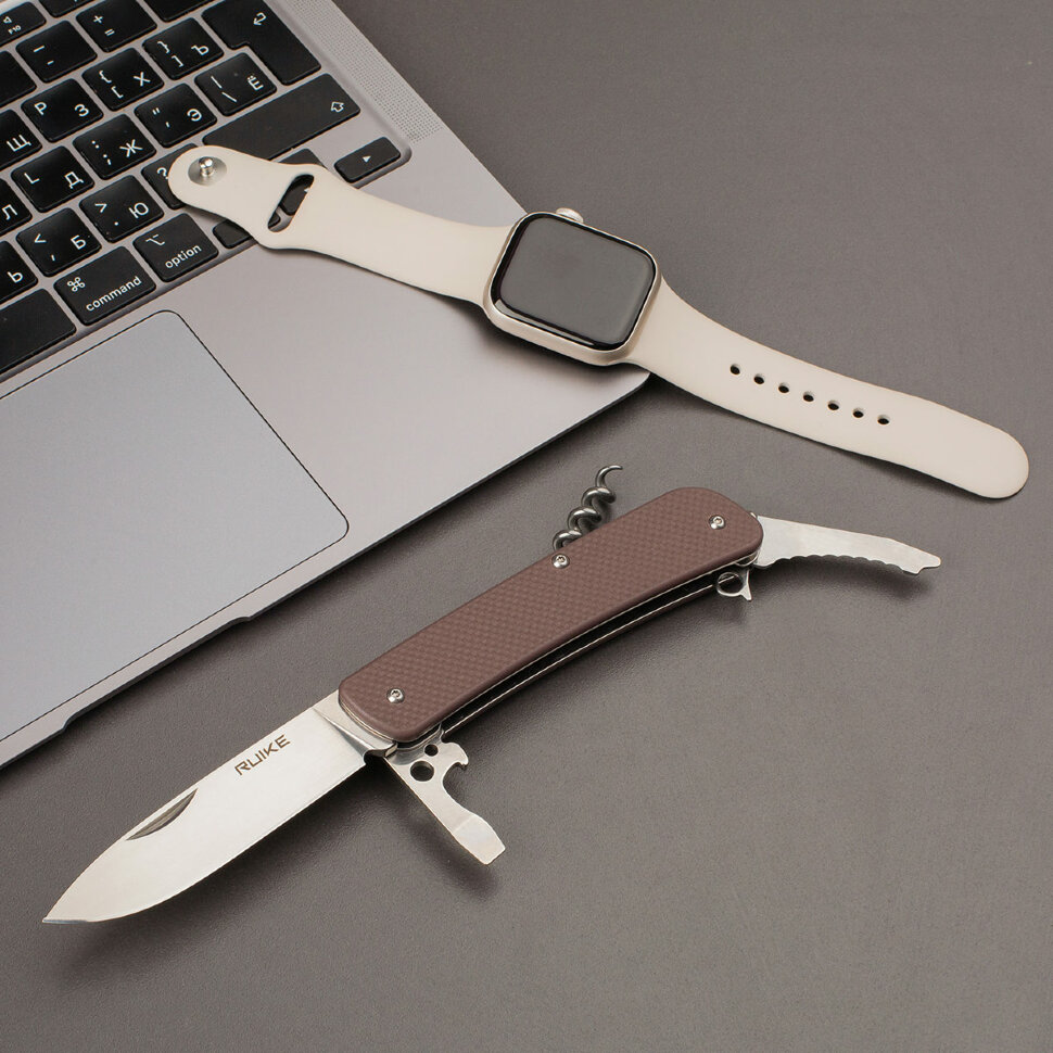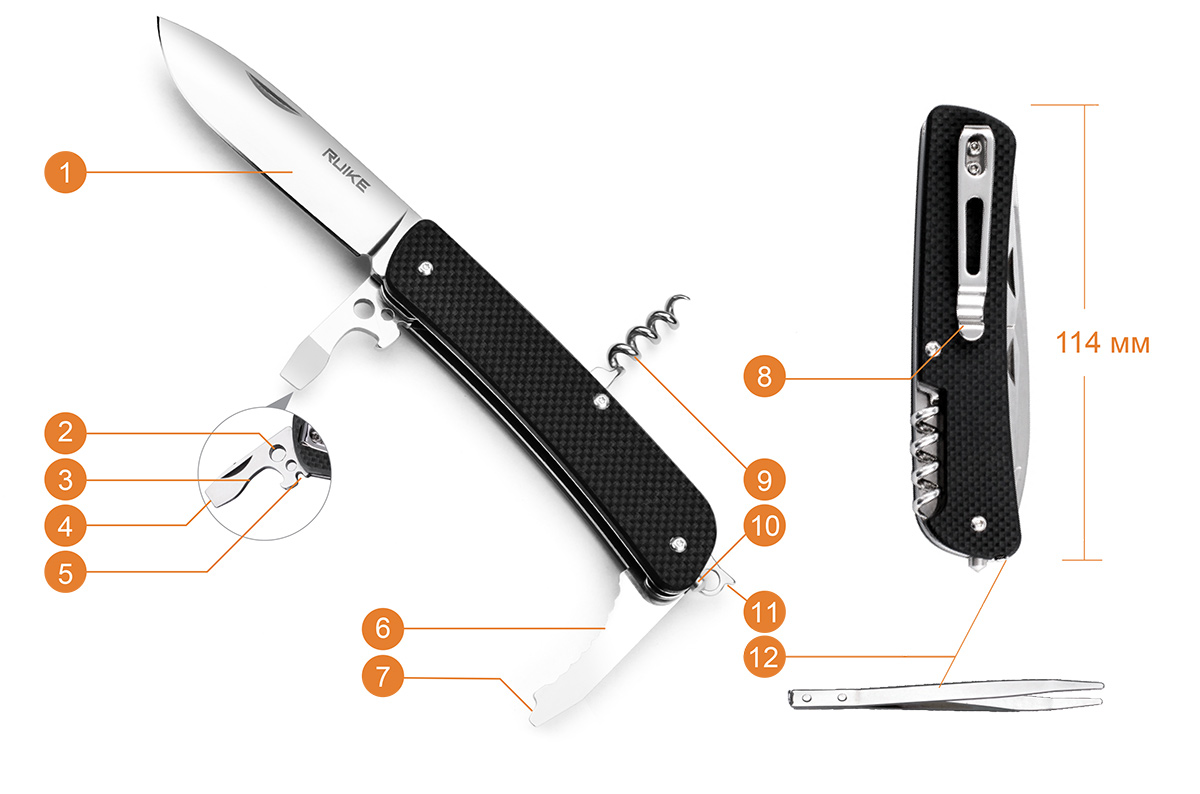 Клинок и инструменты представленного ножа изготавливаются высококачественной нержавеющей стали Шведского производства — Sandvik 12C27. Данный металл обладает прекрасной стойкостью к различным механическим воздействиям и не ржавеет при длительном контакте с влагой. Среди инструментов, в модели Ruike L21, помимо клинка, вы также сможете найти небольшое лезвие с серрейторной заточкой, отвертку с плоским шлицем, комбинированную с открывалкой, откидное кольцо для крепления темляка, съемные щипцы и штопор на «спинке» ножа. В торцовой части также располагается стеклобой.