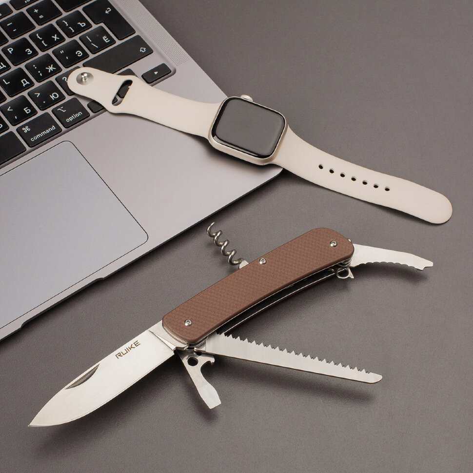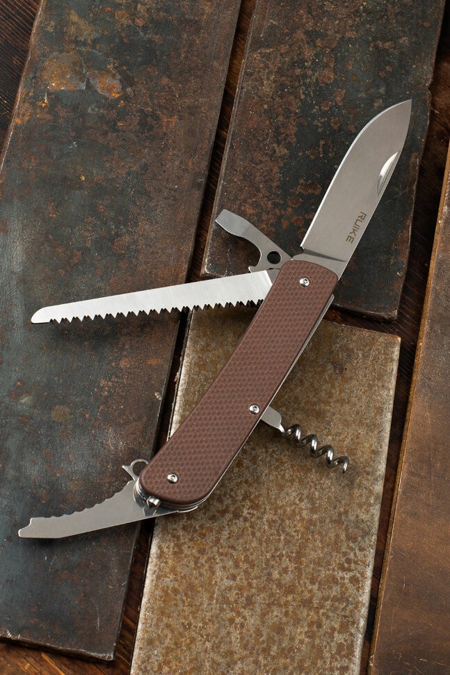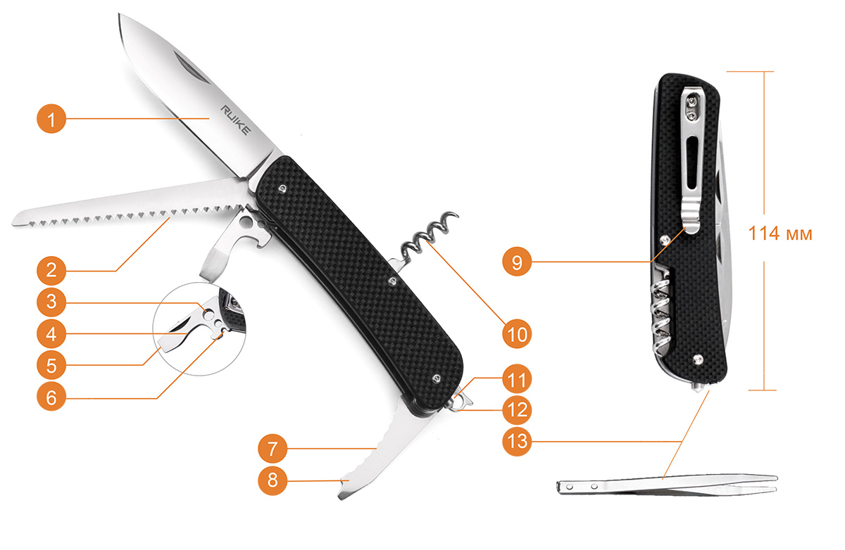 Помимо собственно клинка, данная модель располагает еще несколькими инструментами: штопором, пилой, двумя плоскими отвертками различного размера, открывалкой для бутылок, стропорезом. Все инструменты сделаны из той же стали, что и нож, а потому будут служить вполне практично. Также на торце рукоятки есть стеклобой и кольцо для подвешивания темляка или брелока.