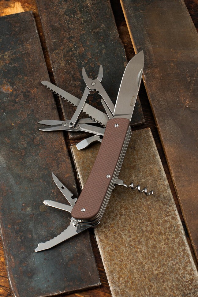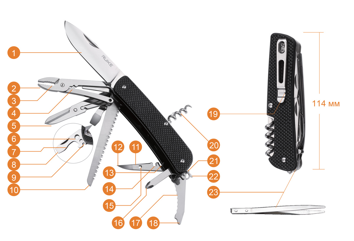 Главным преимуществом складного ножа Ruike L51 является наличие «на борту» множества полезных инструментов, которые могут пригодиться в самых неожиданных ситуациях. Так как L51 — это в первую очередь нож, то и его основным инструментом является клинок длинной 85 мм с толщиной у обуха 3,0 мм. Он выполнен в форме Drop-point, имеет прямую заточку и отлично подходит как для работы с продуктами, так и для реза бумаги/картона/древесины.