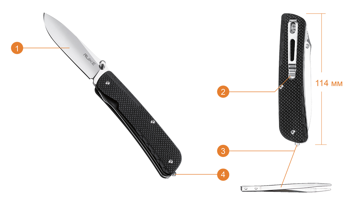 Сама же ручка ножа Ruike LD11 изготовлена с применением композитного стеклопластика, имеющего название G10. Из него выполнены две накладки черного цвета, которые надежно прикручены к стальному основанию. Использование данного легкого материала позволило уменьшить вес ножа до 95 грамм.