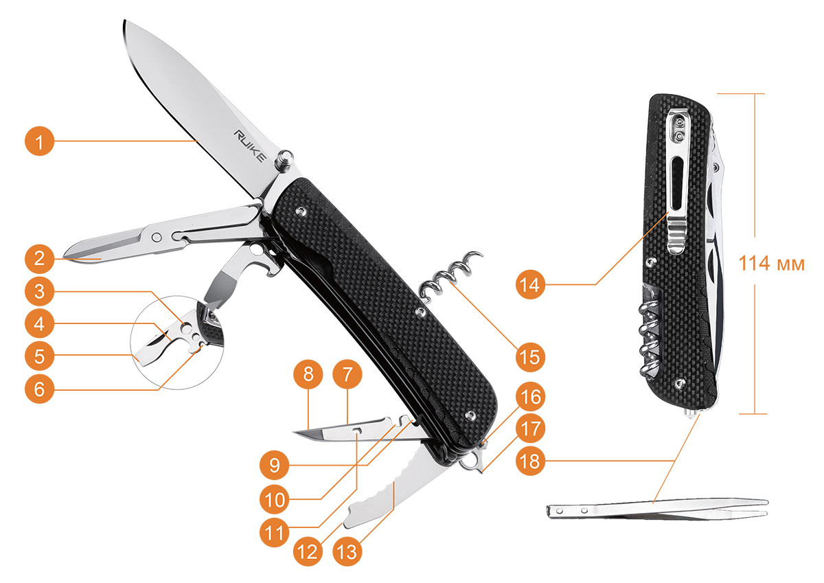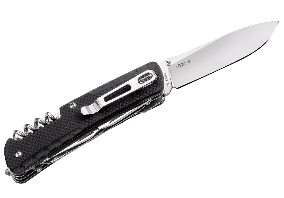Нож Ruike LD-31 точно понравится вам, если необходим небольшой по размеру инструмент, который сможет справиться с огромным количеством заданий. Это складной многофункциональный нож, который в состоянии выполнять 18 различных функций. Основной его инструмент — это сам нож. Он имеет длину 85 мм, а толщину — 3 мм. Шлифовка клинка сделана зеркальной, а его заточка — гладкая. Для данного лезвия, как и для всех прочих инструментов этого ножа, используется сталь 12C27. Это полностью нержавеющий сплав, изготовленный на территории Швеции, который благодаря большой чистоте от примесей имеет отличные рабочие качества. В том числе, данный тип стали закаляется до 59 HRC. Нож удерживается открытым при помощи специально встроенного замка Liner Lock.