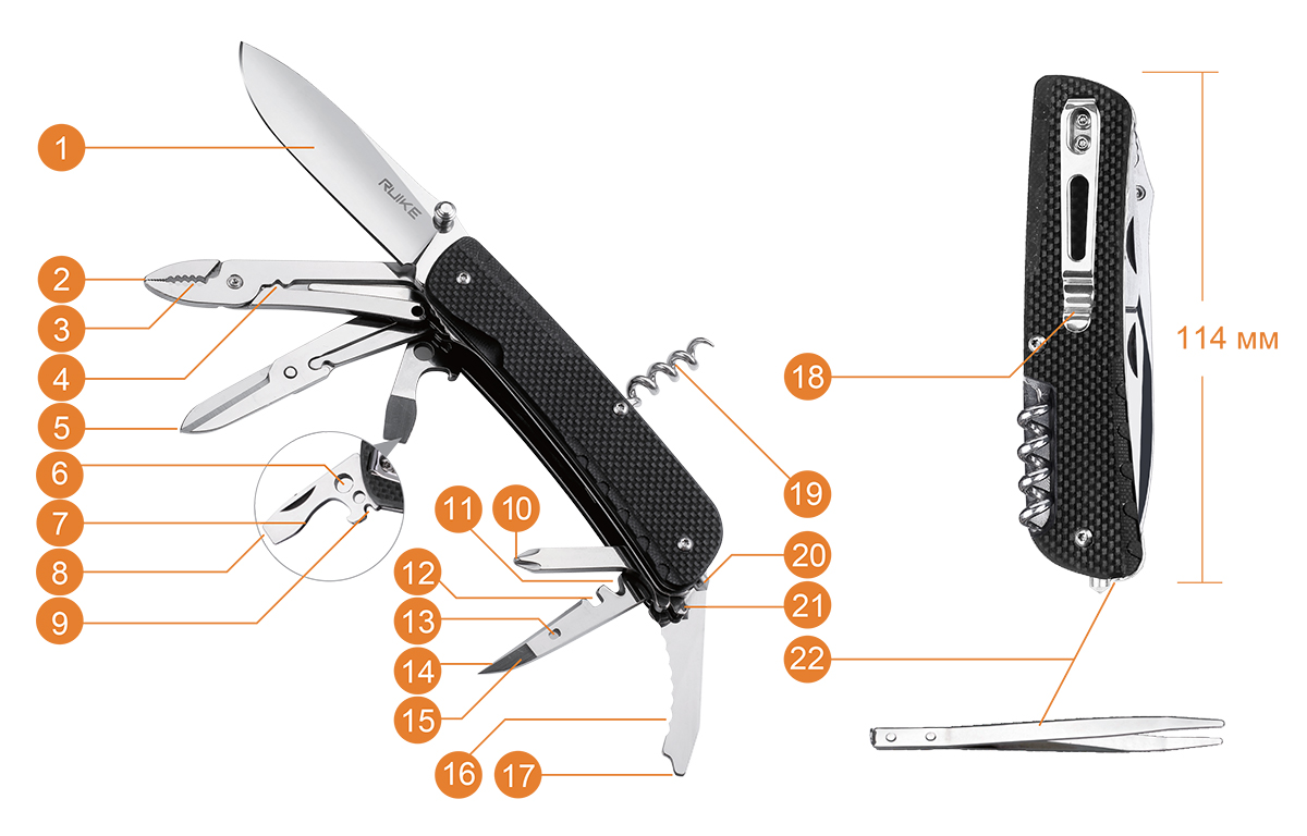 Ruike LD41 имеет в арсенале целых 22 инструмента. В составе есть плоскогубцы, кусачки, ножницы, загиб для проволоки, открывалка, несколько отвёрток (в том числе и крестовая), приспособление для снятия изоляции, развёртка, шило, штопор, стеклобой, отверстие под темляк и пинцет. Такой набор действительно станет полезным в самых разных жизненных ситуациях.