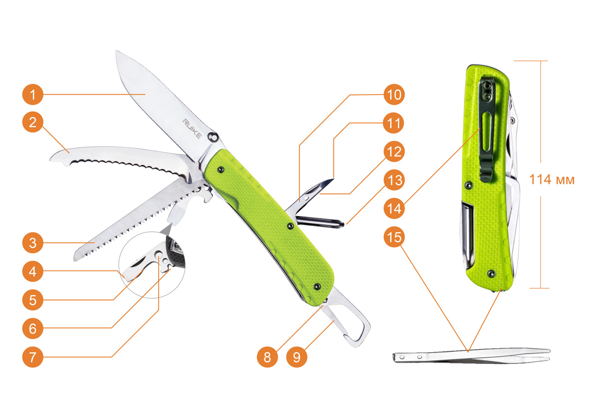 Многофункциональный нож — тот инструмент, который непременно пригодится каждому человеку, который любит отдыхать на природе или же проводить время за городом активно. Модель Ruike LD43 также принадлежит к данной категории. Это удобный складной нож, который располагает не только лезвием с прямой заточкой (его длина составляет 85 мм), но и целым рядом дополнительных функций. Всего с помощью такого ножа можно выполнять 15 различных операций. В том числе, к услугам владельца ножа предлагаются клинок с серрейторной заточкой, пила для дерева, открывалка для бутылок и для консервных банок, стеклобой, два инструмента для зачистки проводов разного диаметра, широкое заточенное шило, обыкновенная прямая и крестовая отвертки, а также пинцет, который вынимается из корпуса ножа и используется отдельно.