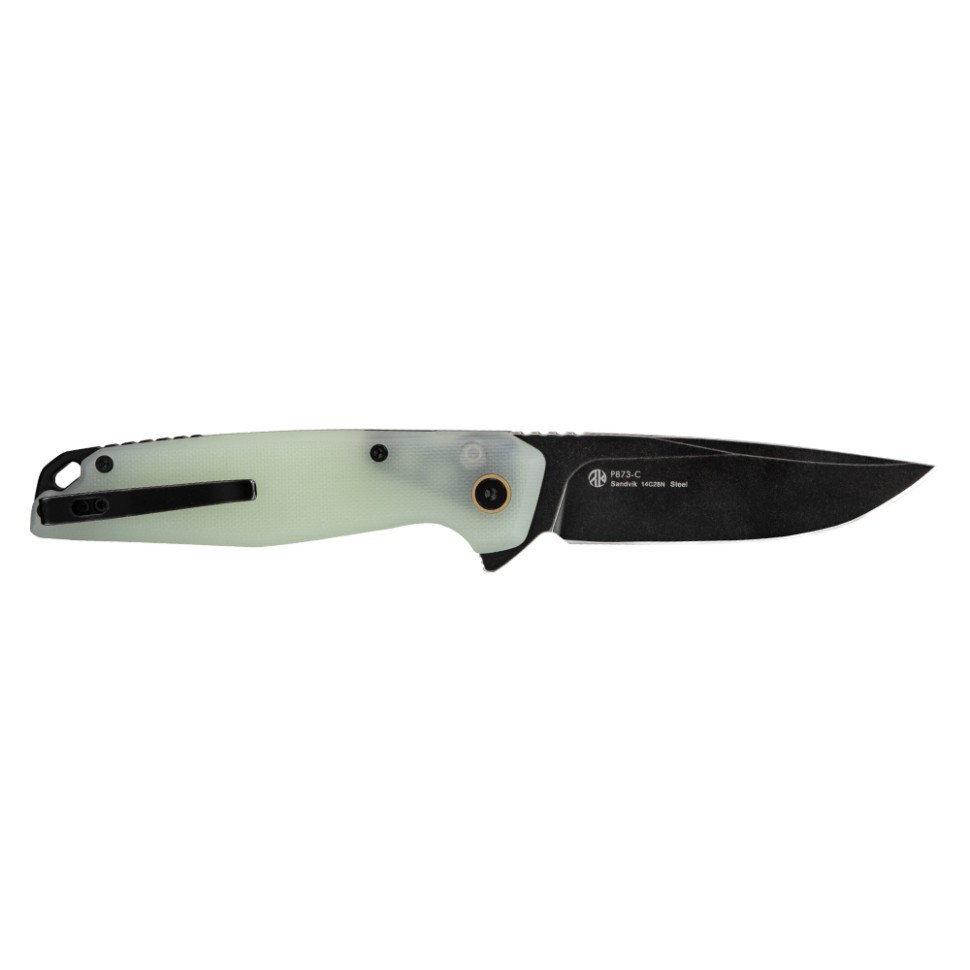 В качестве материала рукояти был выбран композитный материал G10, состоящий из стекловолокна и эпоксидной смолы. Нож с ручкой G10 обладает легкостью, высокой прочностью, стойкостью к износу, ударопрочностью. Стеклотекстолит отлично держит форму и не пропускает влагу, поэтому такой нож будет служить вам долгое время. Удобная клипса дает возможность закрепить нож на кармане, на поясе или на сумке.