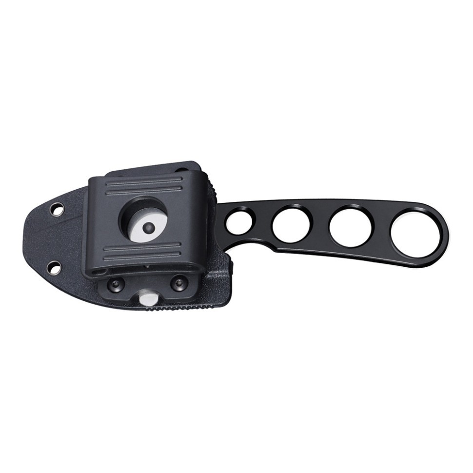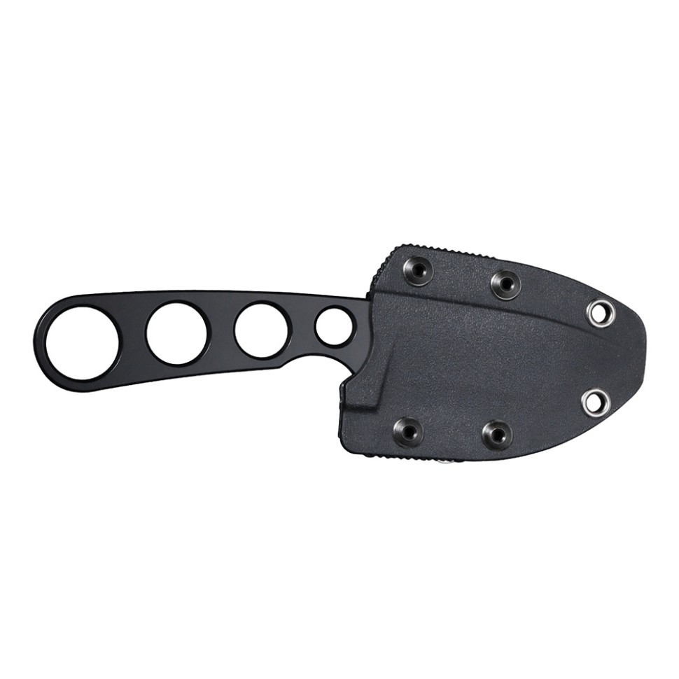 В комплект входят прочные ножны из ABS-пластика с универсальной съемной клипсой, которая позволяет зафиксировать нож вертикально, горизонтально или даже носить его на шее. Конструкция ножен надежно удерживает нож и позволяет быстро извлекать его при необходимости. Дополнительной практической деталью является подпальцевая выемка у основания клинка — она защищает от случайного повреждения при заточке или правке.