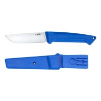 Рукоять туристического ножа выполнена из высокопрочного композитного материала PA66 с добавлением стекловолокна (GF). Он отличается отличной механической прочностью, термостойкостью и стойкостью к износу. Эргономичная форма и текстура обеспечивают надежный хват даже во влажной среде, предусмотрен упор для большого пальца и ограничитель, который не позволит руке соскользнуть на лезвие при работе. Яркий цвет рукоятки — синий — не позволит ножу затеряться среди другой экипировки.