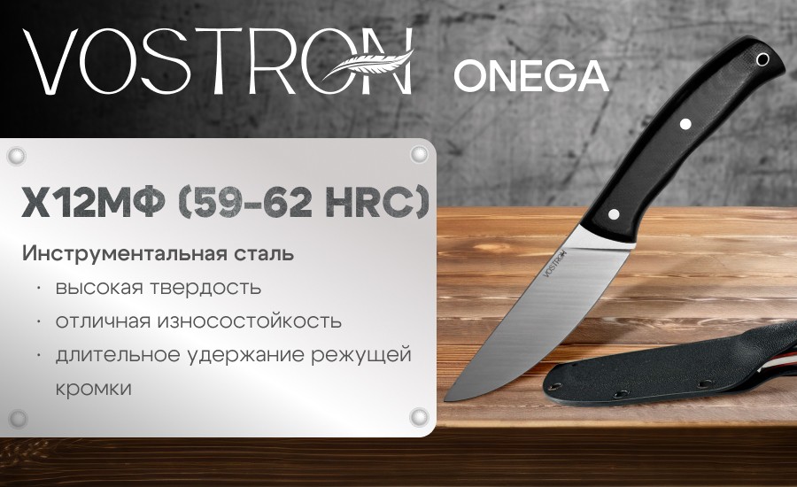 Vostron Onega — фиксированный нож, идеально подходящий для туризма. Клинок ножа выполнен из прочной инструментальной стали Х12МФ, рукоять — из стеклотекстолита G10. Общая длина ножа — 228 мм, вес — 158 г. В комплекте предусмотрены удобные ножны, которые позволяет безопасно хранить и носить нож.