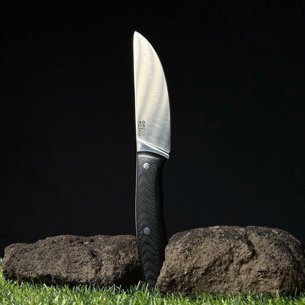 Для клинка Vostron Onega используется инструментальная сталь Х12МФ. Это сталь холодного деформирования с высоким содержанием хрома, а также включением молибдена и ванадия. Она обладает высокой прочностью и отлично держит заточку в течение длительного времени. Такой клинок станет незаменимым в походных условиях и позволит справиться с самыми разнообразными задачами — нарезать ветки для костра или открыть консервную банку, если нет других инструментов. Зонная закалка клинка по японской технологии позволила получить высокую твердость в районе режущей кромки и одновременно улучшить механические характеристики на пяте и обухе клинка. Твердость стали достигает 59-62 HRC. По сравнению с другими углеродистыми сталями Х12МФ обладает хорошей коррозионной стойкостью. Но все же требует ухода — после использования клинок стоит протереть насухо, прежде чем убрать в ножны.