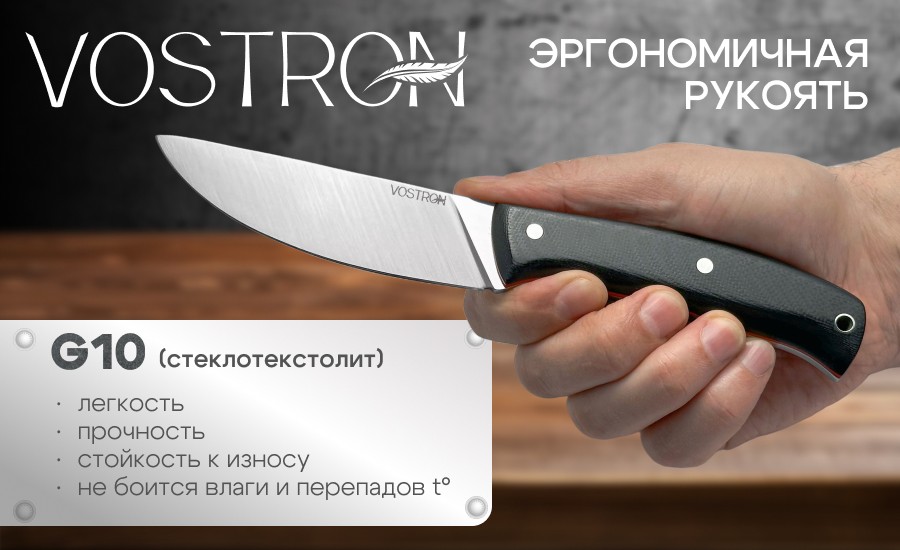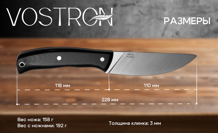 Vostron Onega — фиксированный нож, идеально подходящий для туризма. Клинок ножа выполнен из прочной инструментальной стали Х12МФ, рукоять — из стеклотекстолита G10. Общая длина ножа — 228 мм, вес — 158 г. В комплекте предусмотрены удобные ножны, которые позволяет безопасно хранить и носить нож.