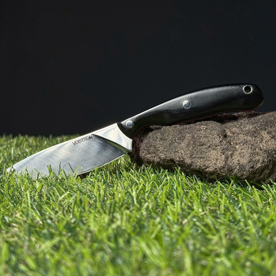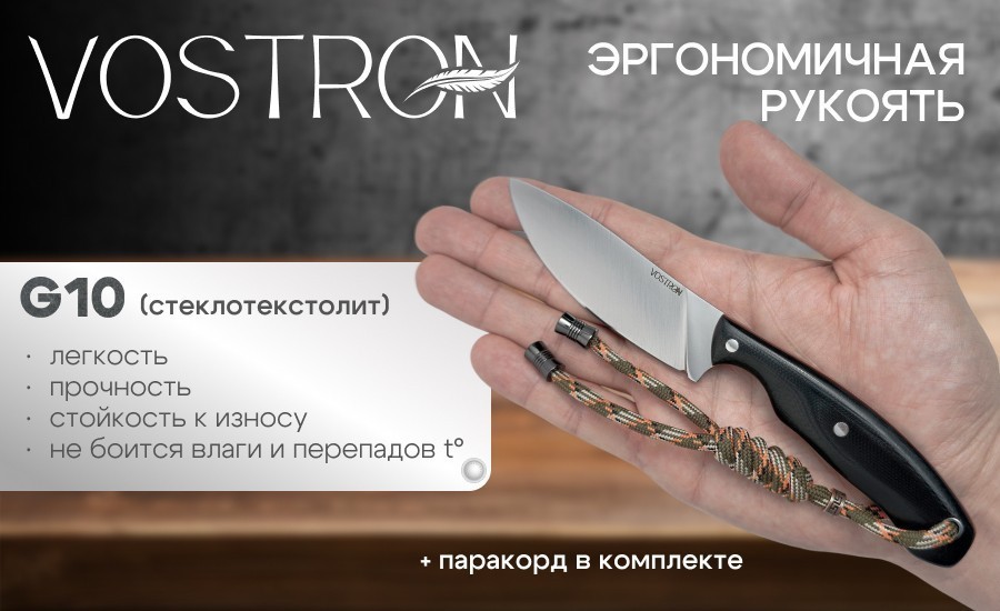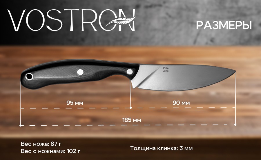 Vostron Pika — небольшой фиксированный нож, идеально подходящий для туризма. Клинок ножа выполнен из прочной инструментальной стали VG10, рукоять — из стеклотекстолита G10. Общая длина ножа — 185 мм, вес — 87 г. В комплекте предусмотрен удобные ножны, которые позволяет безопасно хранить и носить нож.