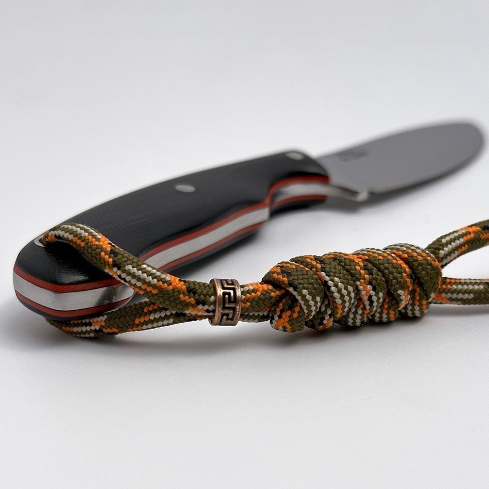 Рукоять черного цвета с красными вставками по внутренней части накладок придает ножу стильный и аутентичный внешний вид. В рукоятке есть отверстие для темляка. Вместе с ножом в комплекте идет крепкий паракорд.
