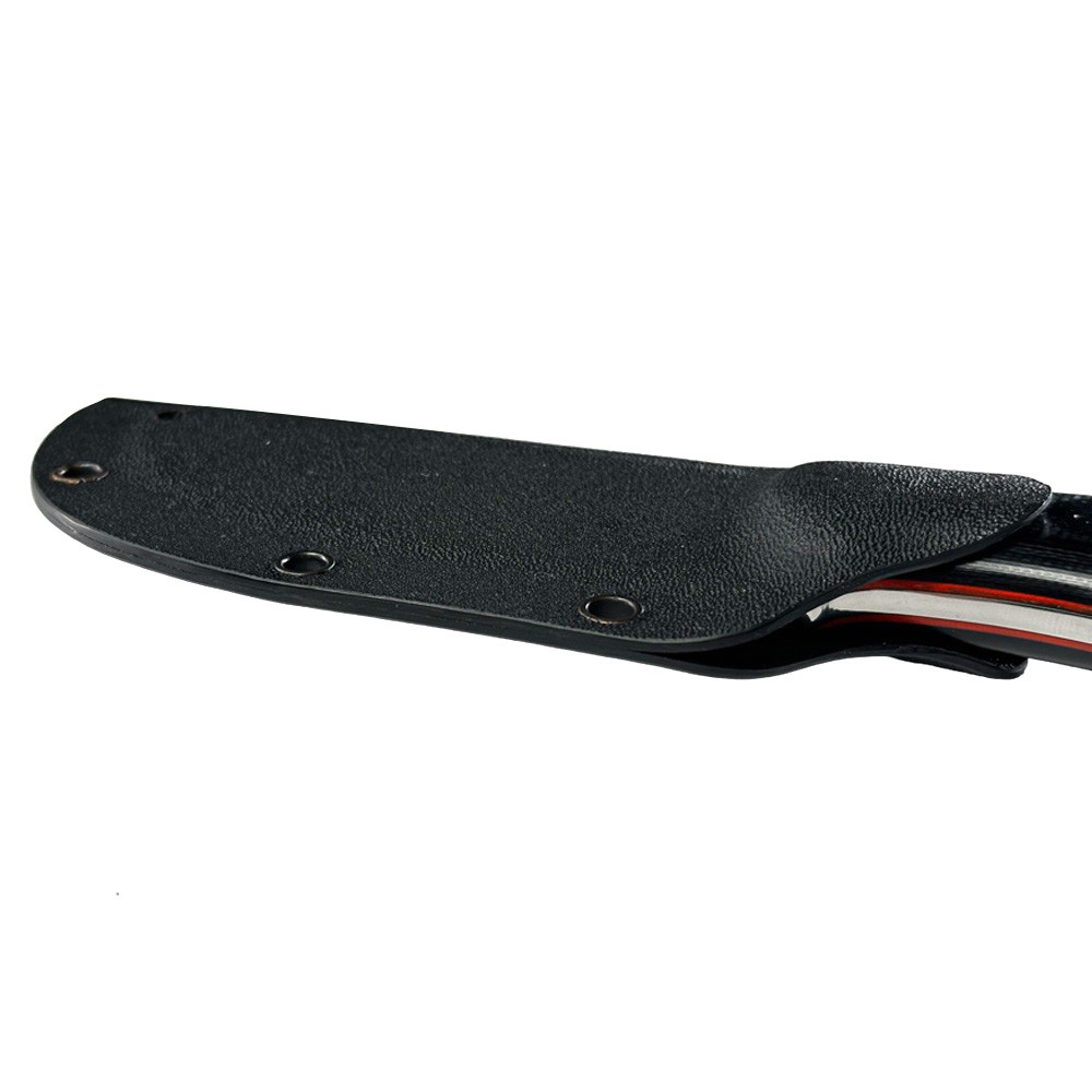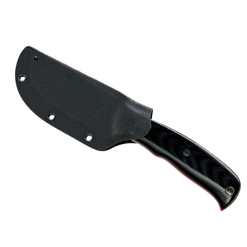 Рукоять черного цвета с красной полосой по внутренней части накладок придает ножу стильный и аутентичный внешний вид. Есть отверстие для темляка.