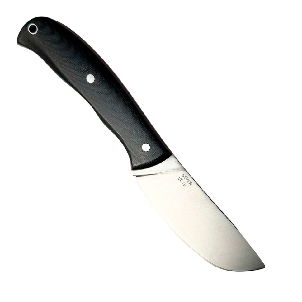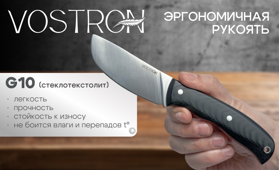 Vostron Sever — фиксированный нож, идеально подходящий для туризма. Клинок ножа выполнен из прочной инструментальной стали VG10, рукоять — из стеклотекстолита G10. Общая длина ножа — 210 мм, вес — 150 г. В комплекте предусмотрены удобные ножны, которые позволяет безопасно хранить и носить нож.