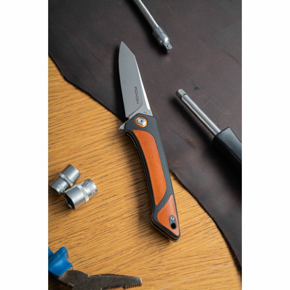 Складной нож Roxon K2 D2 Steel для занятий туризмом и активным отдыхом. Доступен Roxon K2 в трёх разных вариантах расцветки: оранжевая, коричневая, белая. Это мощный и острый нож. Удобен в применении. Форма клинка – drop point, напоминает с виду вытянутую каплю. Эта разновидность лезвия считается универсальной – ею легко выполнять самые разные операции, как режущие действия, так и колющие. Что очень кстати во время отдыха на свежем воздухе. Ножом удобно разрезать, стругать, мелко рубить, сдирать что-либо и выковыривать. Таким образом, многие операции облегчаются при помощи всего одного инструмента. Для изготовления лезвия использовали сразу три вида высококачественной стали, а именно: D2, S35VN, 12C27.