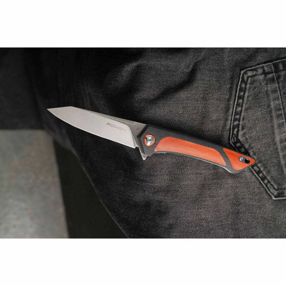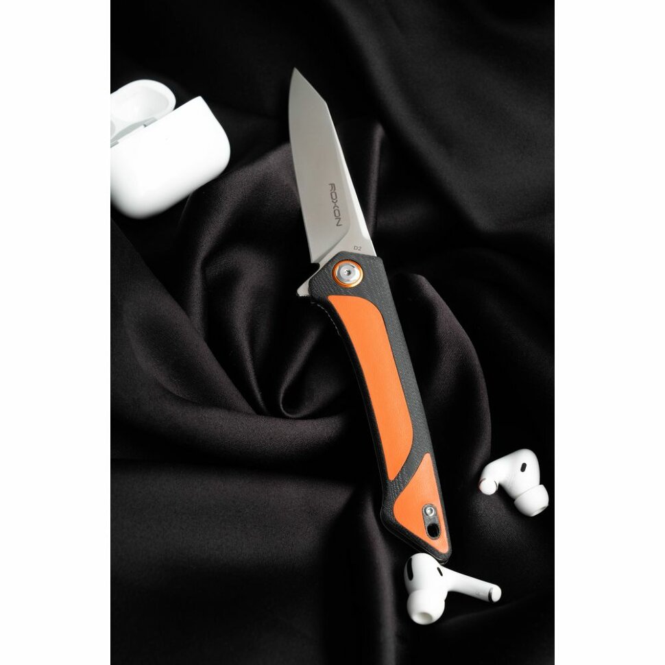 Складной нож Roxon K2 D2 Steel для занятий туризмом и активным отдыхом. Доступен Roxon K2 в трёх разных вариантах расцветки: оранжевая, коричневая, белая. Это мощный и острый нож. Удобен в применении. Форма клинка – drop point, напоминает с виду вытянутую каплю. Эта разновидность лезвия считается универсальной – ею легко выполнять самые разные операции, как режущие действия, так и колющие. Что очень кстати во время отдыха на свежем воздухе. Ножом удобно разрезать, стругать, мелко рубить, сдирать что-либо и выковыривать. Таким образом, многие операции облегчаются при помощи всего одного инструмента. Для изготовления лезвия использовали сразу три вида высококачественной стали, а именно: D2, S35VN, 12C27.