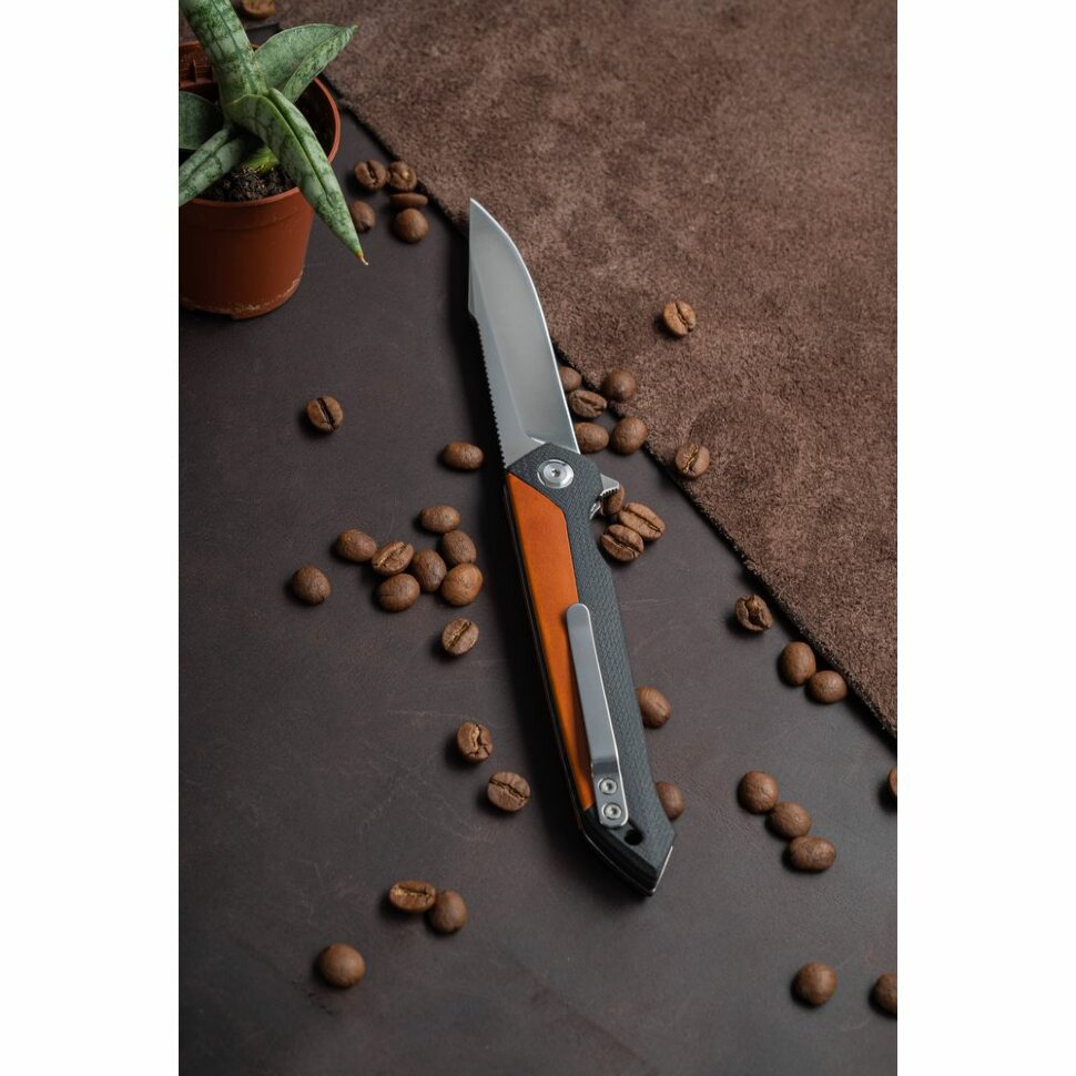 Это мощный и острый инструмент. Он удобен для нарезания, строгания, измельчения, обдирания чего-либо, выковыривания. Продолговатый и рельефный подпальцевый упор на лезвии способствует комфорту при работе. Нож компактным образом складывается, и помещается в карман – он миниатюрный, лёгкий и эргономичный. Для удобства фиксации предусмотрена клипса – она позволяет прицепить модель к поясу, к карману брюк, либо зафиксировать на рюкзаке.