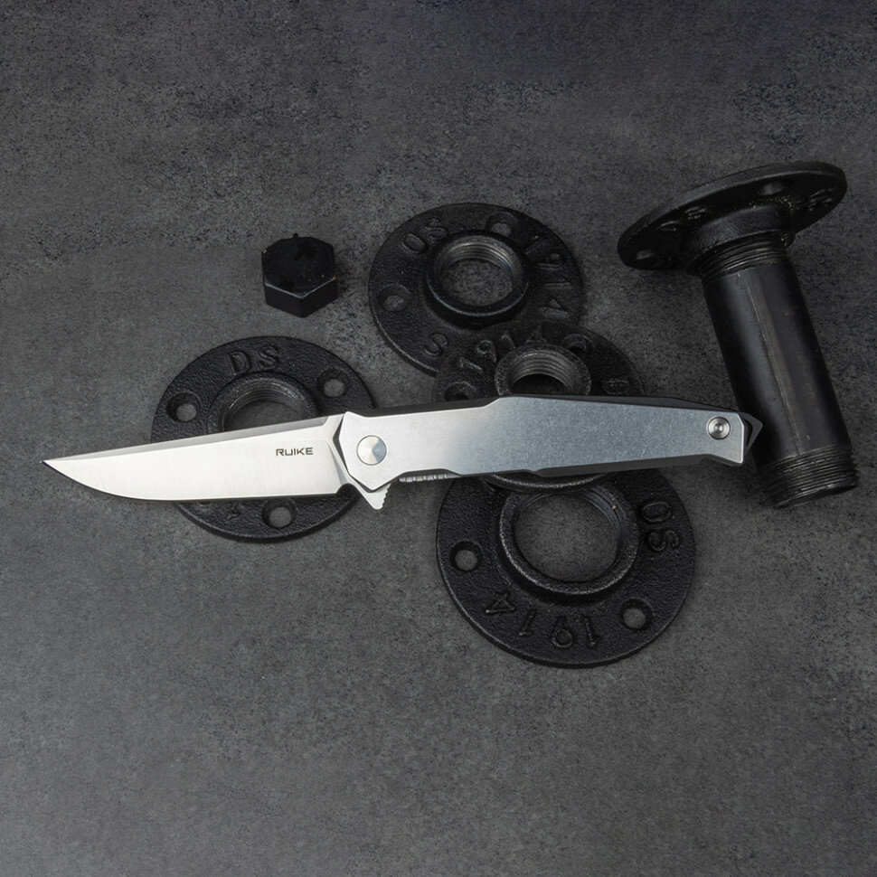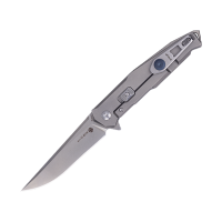 В экземпляре применяется сталь марки 154СМ. Особенность такой стали – в высоком содержании углерода, изначально она была создана для лопаток газовых турбин. Это очень популярный и качественный ножевой материал. Металлический сплав прошел через криогенную обработку, и обладает устойчивостью к коррозии. Твердость клинка достигает 58-60 единиц по шкале Роквелла. Это достаточно высокий показатель, как для подобного типа инструментов. Вес модели составляет 110 грамм, толщина клинка – чуть более 3 миллиметров. Общая длина изделия – 21 сантиметр. Легкое флиппование достигается за счет наличия шайбы с подшипниками. Достаточно простого нажатия на одностороннюю «гарду» с противоскользящими насечками, выступающую из рукоятки в сложенном состоянии. Обух имеет скос в полную длину, сходящийся со спусками в ребре к кончику лезвия. Поверхность клинка прошла через дробеструйную обработку.